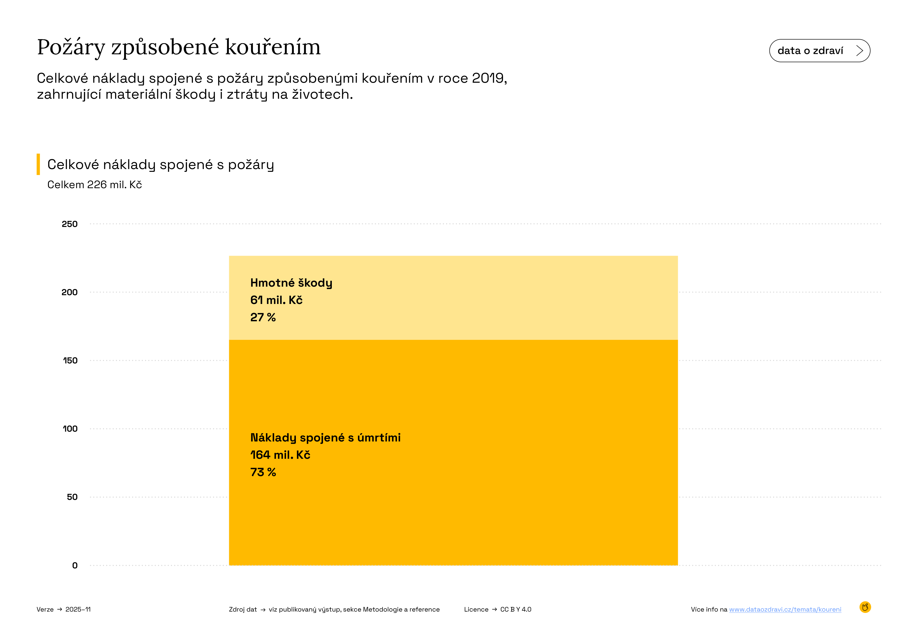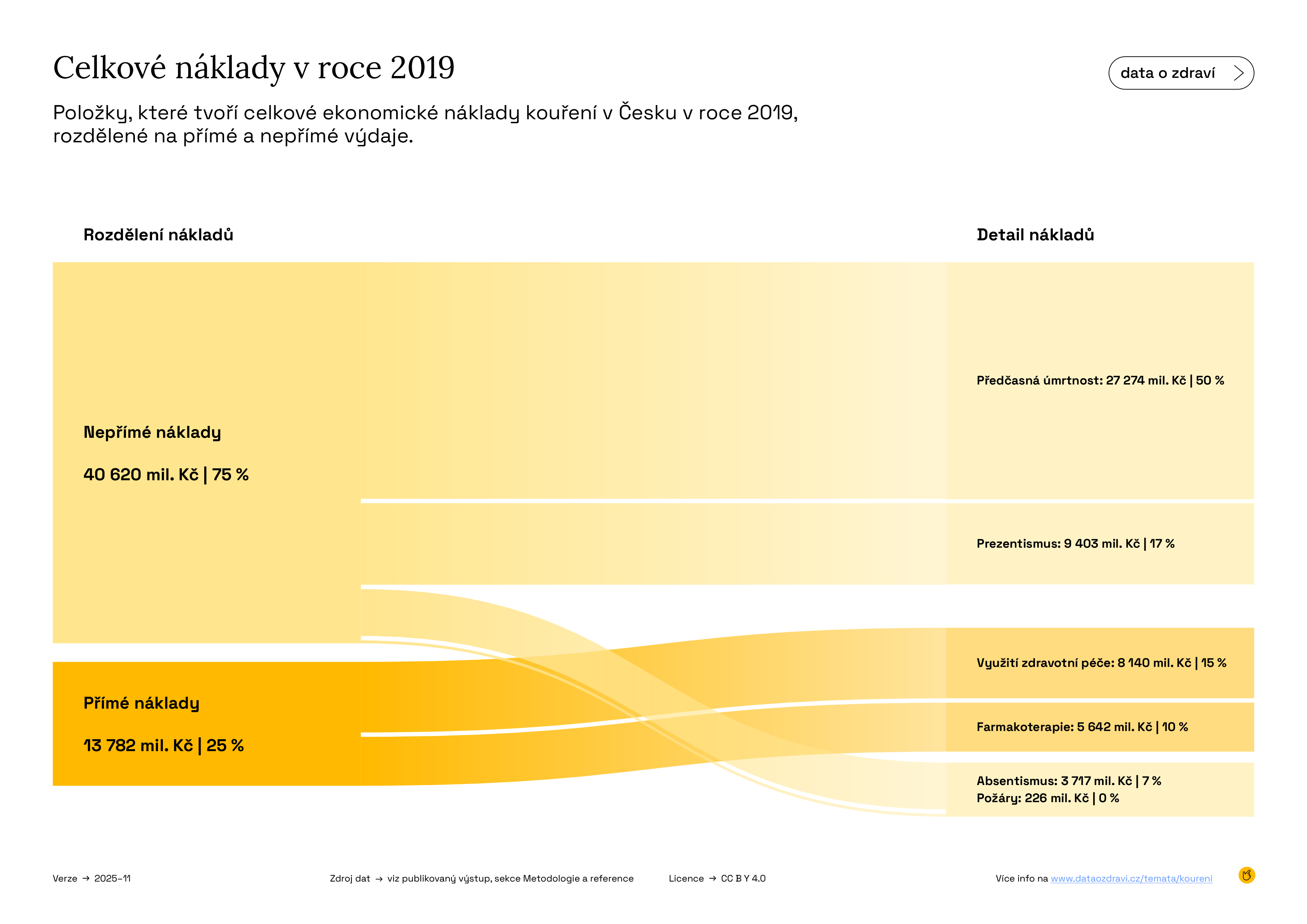 Celková výše odhadovaných nákladů, vypočítána metodou cost-of-illness (COI), za rok 2019 činila 54,40 mld Kč (≈ 0,94 % HDP 2019, 2,12 mld. €), a v roce 2025 po úpravě o inflaci činí 77,98 mld. Kč (≈ 0,97 % HDP 2025, přepočet autora). Většina zátěže je nepřímá: ztráty produktivity tvoří ≈ 75 % (z toho předčasná úmrtnost ≈ 50 %, prezentismus ≈ 17 %, absentismus ≈ 7 %), škody z požárů ≈ 0,4 %. Jde o konzervativní odhad: není v něm započteno pasivní kouření ani neformální péče, proto skutečná zátěž bude spíše vyšší.