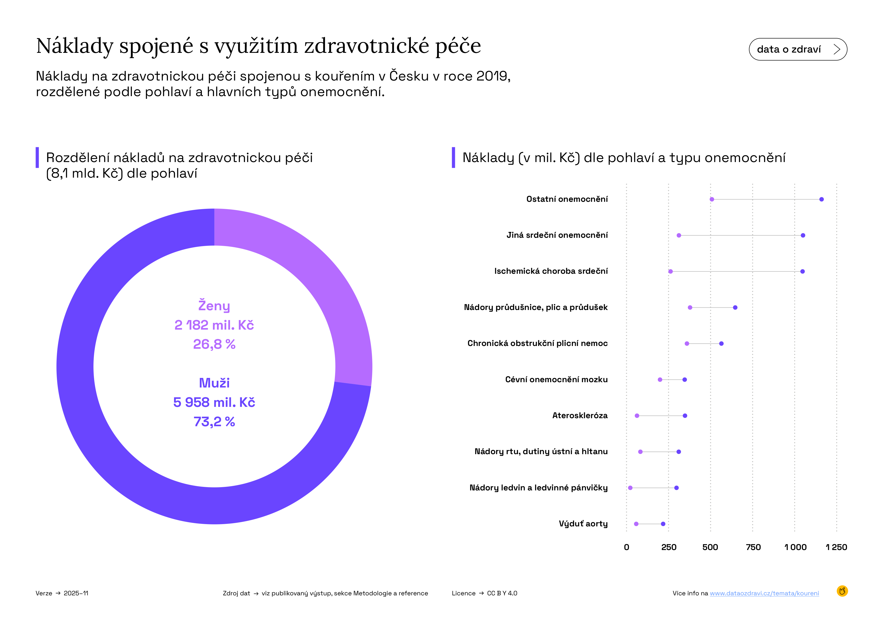 Náklady na tuto péči dosáhly v roce 2019 8,14 mld. Kč (ženy 2,18 mld., muži 5,96 mld.). Na ceny roku 2025 je to 11,67 mld. Kč. Nejvíce se podílejí KV onemocnění, nádory průdušnice, plic a průdušek, CHOPN a cévní mozkové příhody. Nejvyšší náklady se koncentrují ve věku 65–74 let. Mnoha těmto diagnózám lze předejít — snížení kouření by tak ulevilo i rozpočtům zdravotnictví. Současné české odhady navíc nezahrnují dopady pasivního kouření, proto celkové břemeno zdravotní péče podhodnocují.