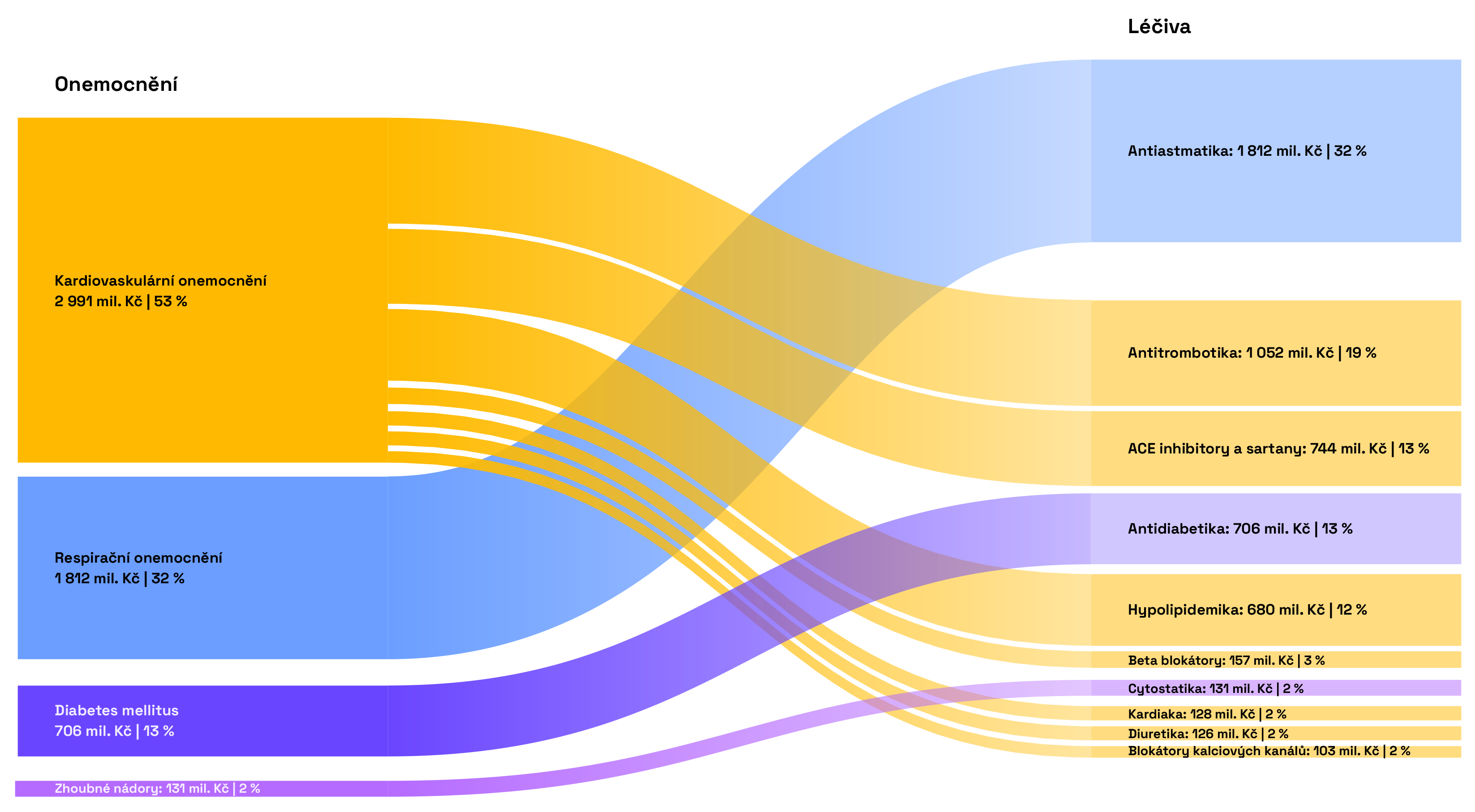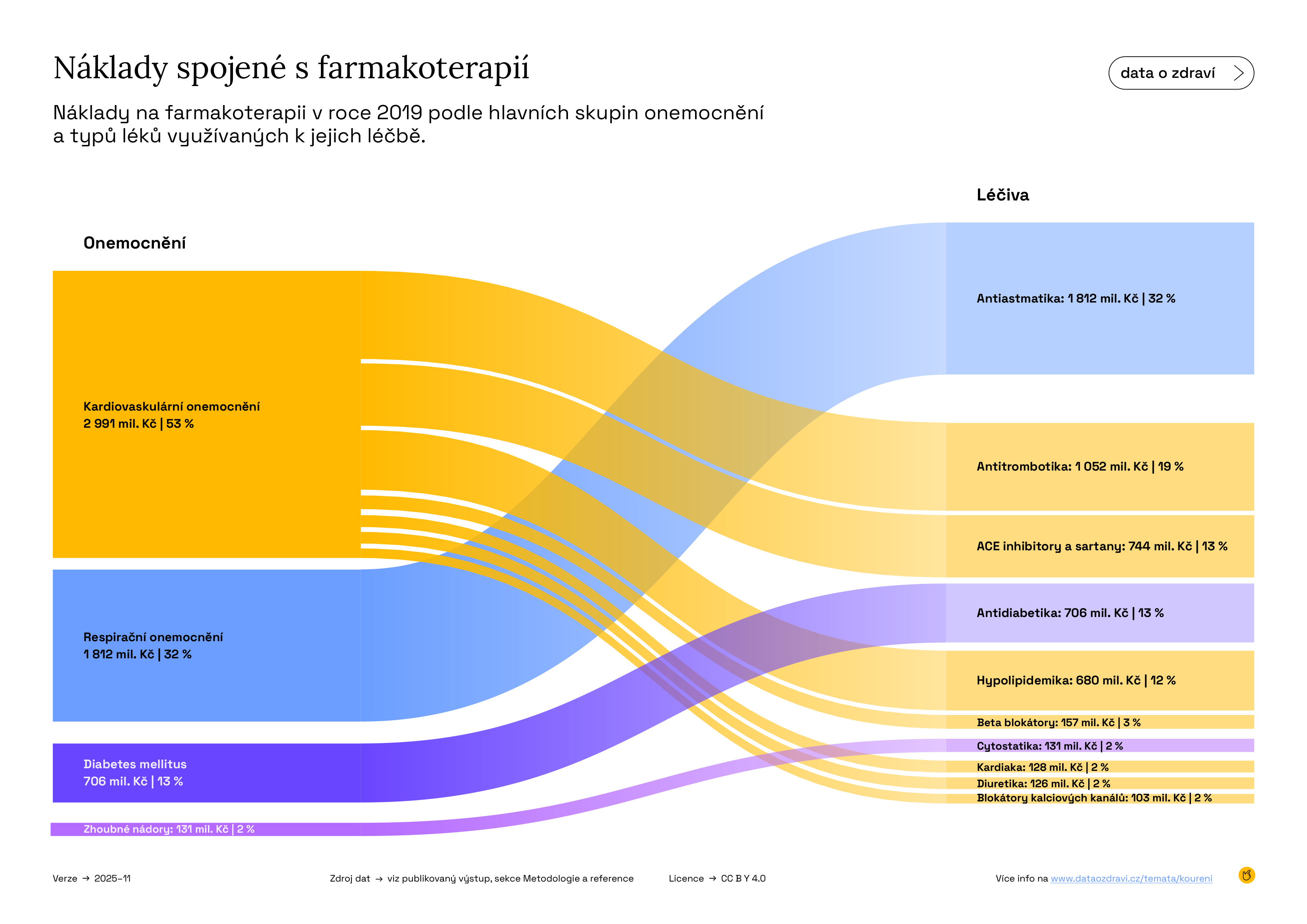 Výše nákladů spojených s farmakoterapií vypočítána top-down metodou: v roce 2019 činily náklady na farmakoterapii 5,64 mld. Kč; na ceny roku 2025 jde o 8,08 mld. Kč. Největší položky tvoří antiastmatika a antitrombotika (respirační a KV onemocnění). V odhadu jsou i ACE inhibitory a sartany, hypolipidemika, antidiabetika, beta-blokátory, cytostatika, kardiaka, diuretika a blokátory kalciových kanálů.