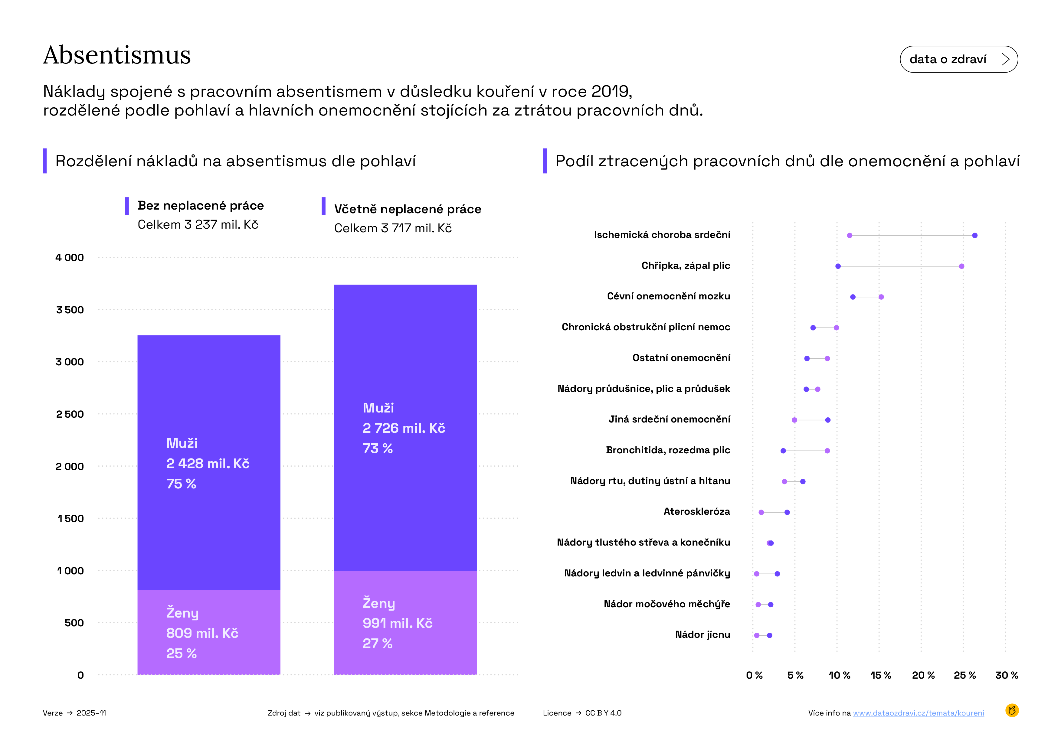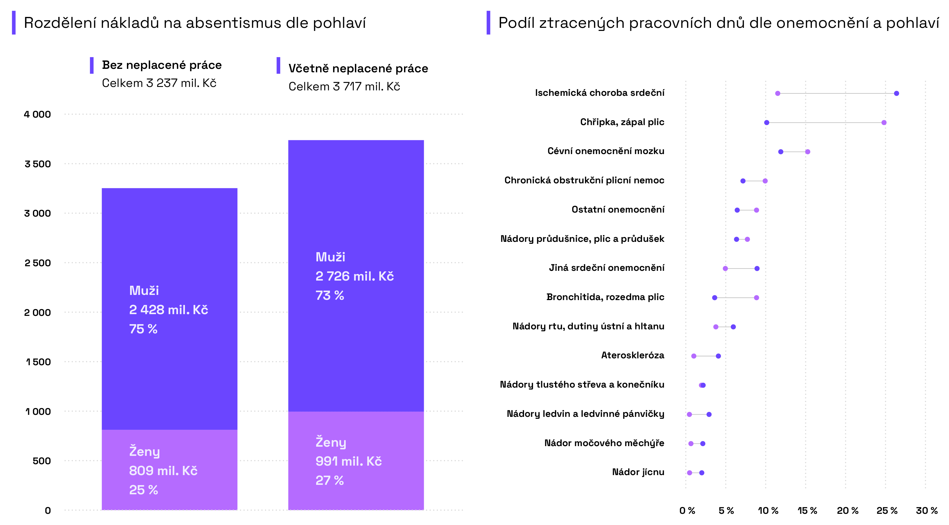 Celkové náklady spojené s absentismem, vypočítané human-capital metodou. V roce 2019 šlo celkem o ≈ 3,7 mld. Kč (144,8 mil. €) včetně neplacené práce; bez ní ≈ 3,2 mld. Kč (126,1 mil. €). Po přepočtu na ceny 2025 je to ≈ 5,3 mld. Kč a ≈ 4,6 mld. Kč. Nejvíc dnů se ztratilo kvůli ischemické chorobě srdeční (22,1 %), chřipce a zápalu plic (14,3 %) a cévním onemocněním mozku (12,8 %); relativně nejvyšší ztráty jsou ve věku 55–64 let.