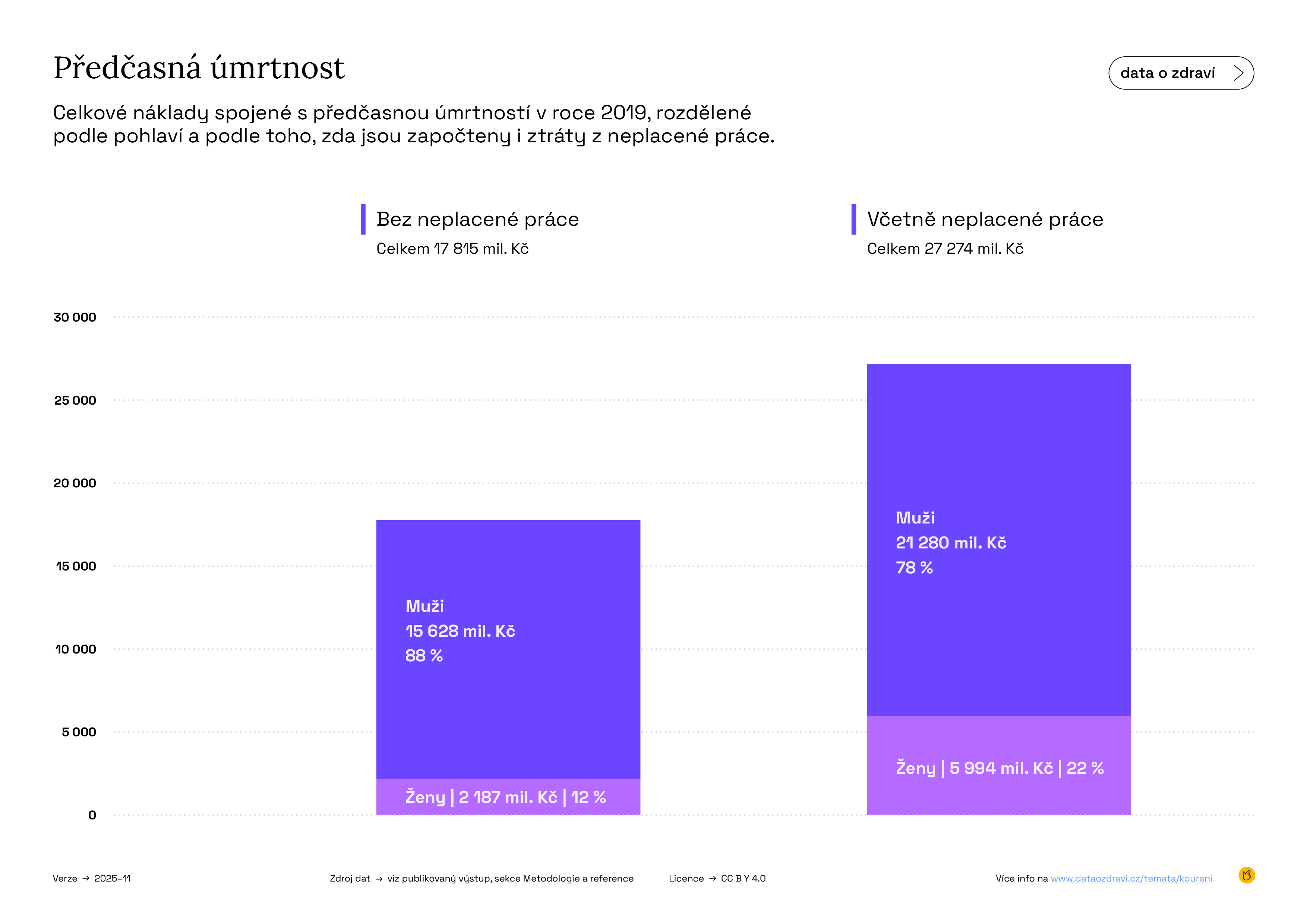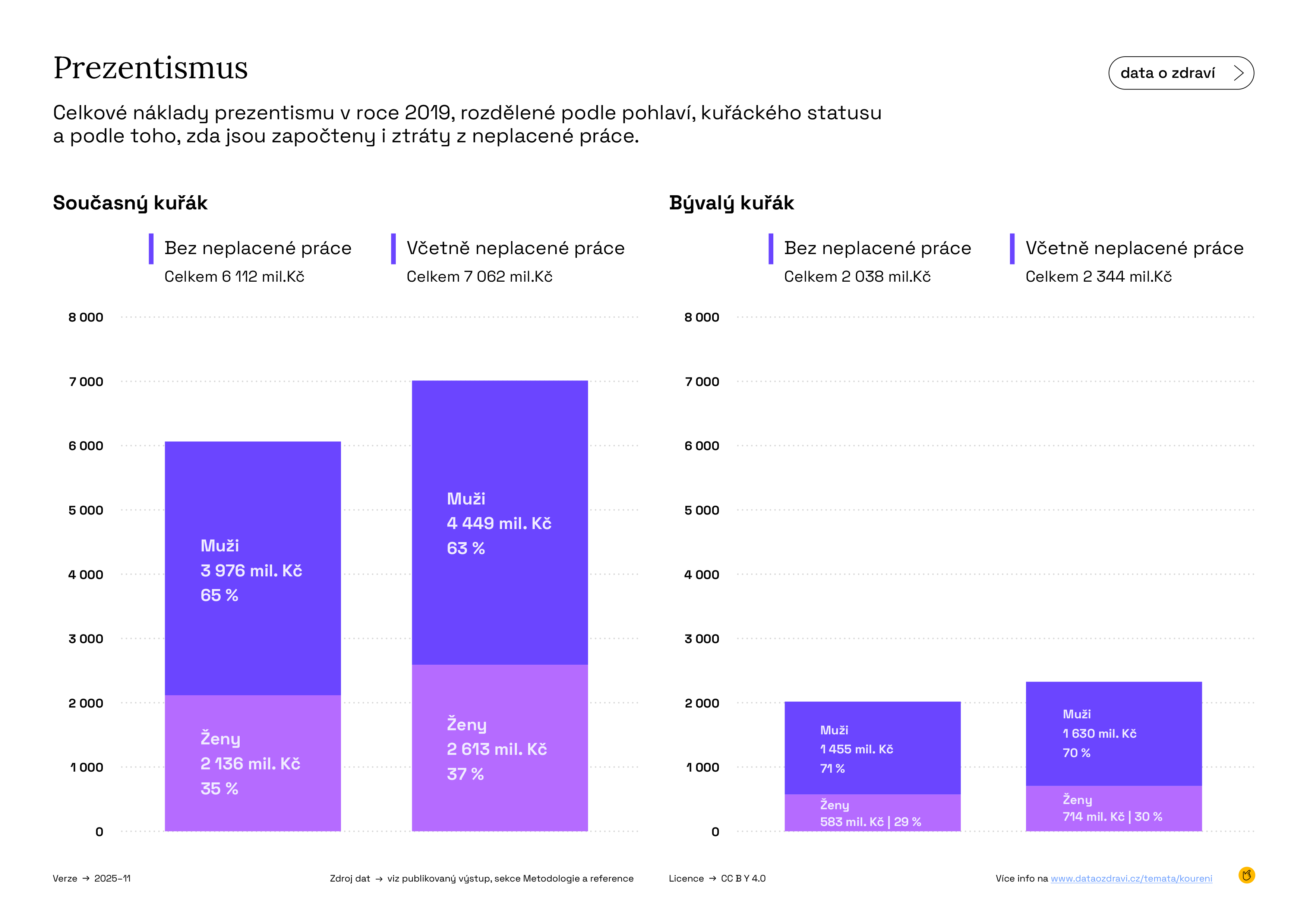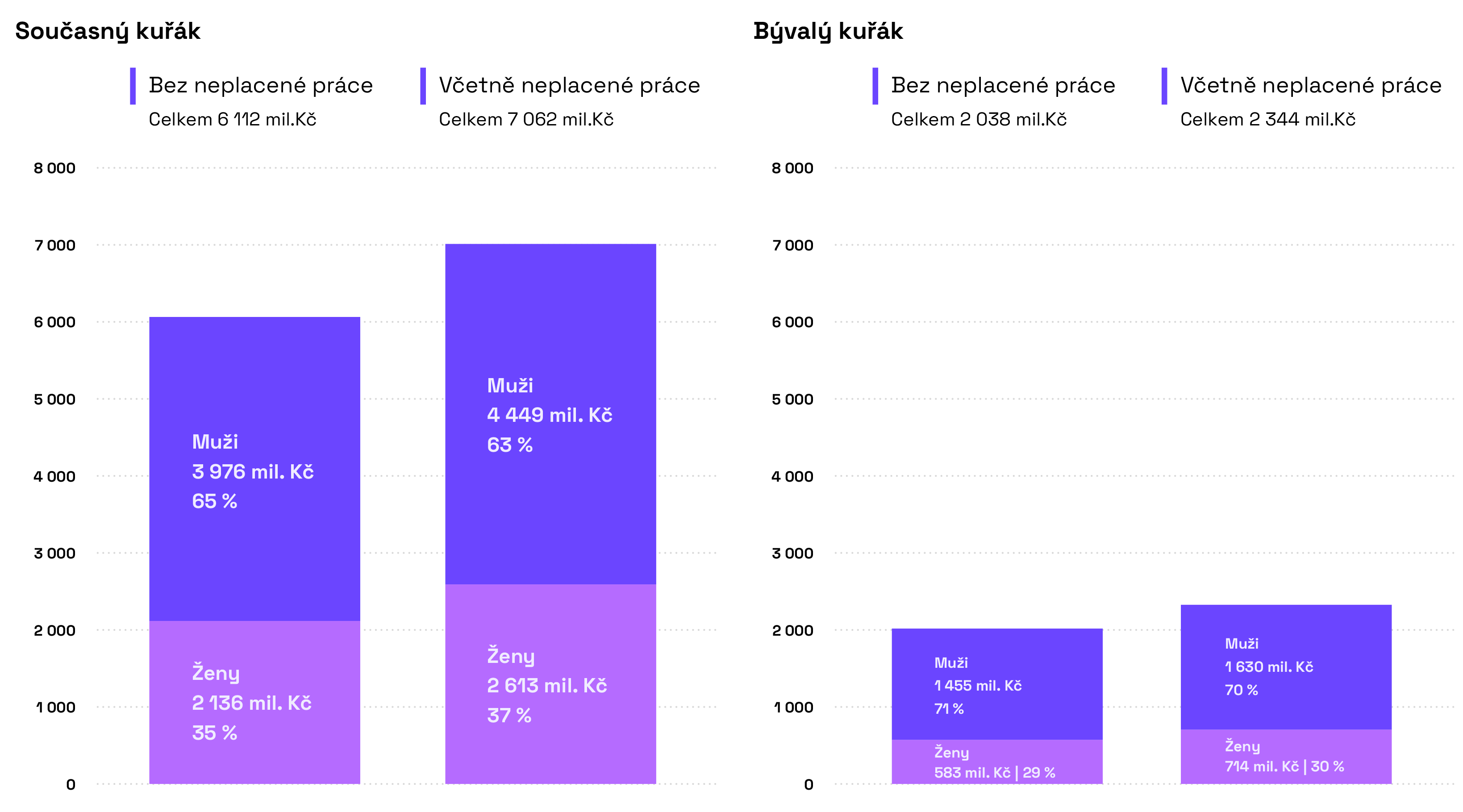 Z celkových nákladů na kouření v roce 2019 připadaly téměř tři čtvrtiny (74 %) na muže. Hlavním důvodem je vyšší míra kouření mezi muži (16,2 % kuřaček vs. 23,8 % kuřáků; 14,9 % vs. 24,7 % bývalých kuřaček/kuřáků) a také vyšší průměrná mzda, což se výrazně promítá do ekonomických ztrát spojených s absencí či předčasnými úmrtími. V přepočtu na jednotlivce odpovídají náklady za rok 2019 přibližně 20 000 Kč na každého stávajícího nebo bývalého kuřáka ve věku 35+ (Landovská, 2025).