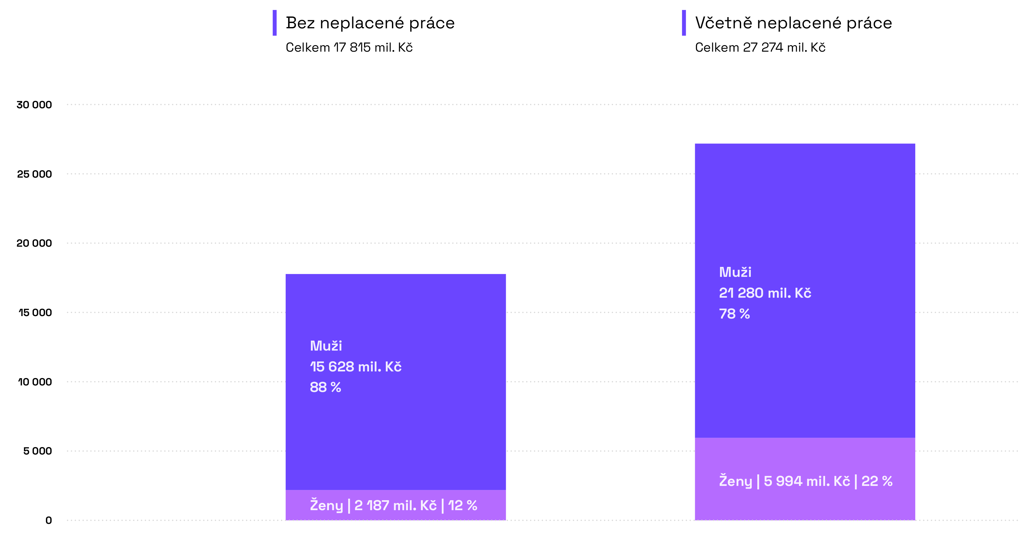 Pozn.: včetně neplacené práce připadá ≈ 991 mil. Kč na ženy a ≈ 2,73 mld. Kč na muže; bez neplacené práce ≈ 809 mil. Kč a ≈ 2,43 mld. Kč.