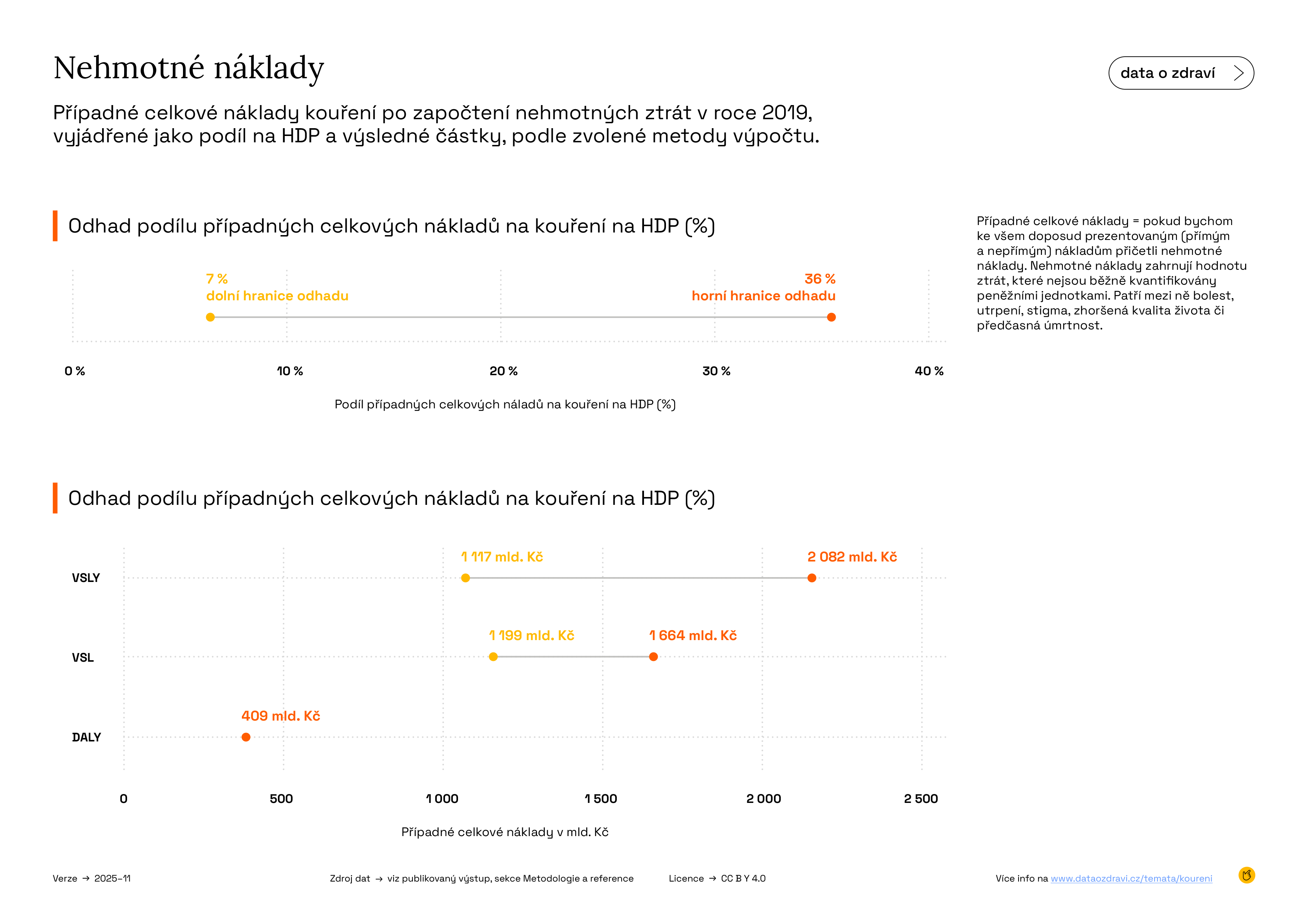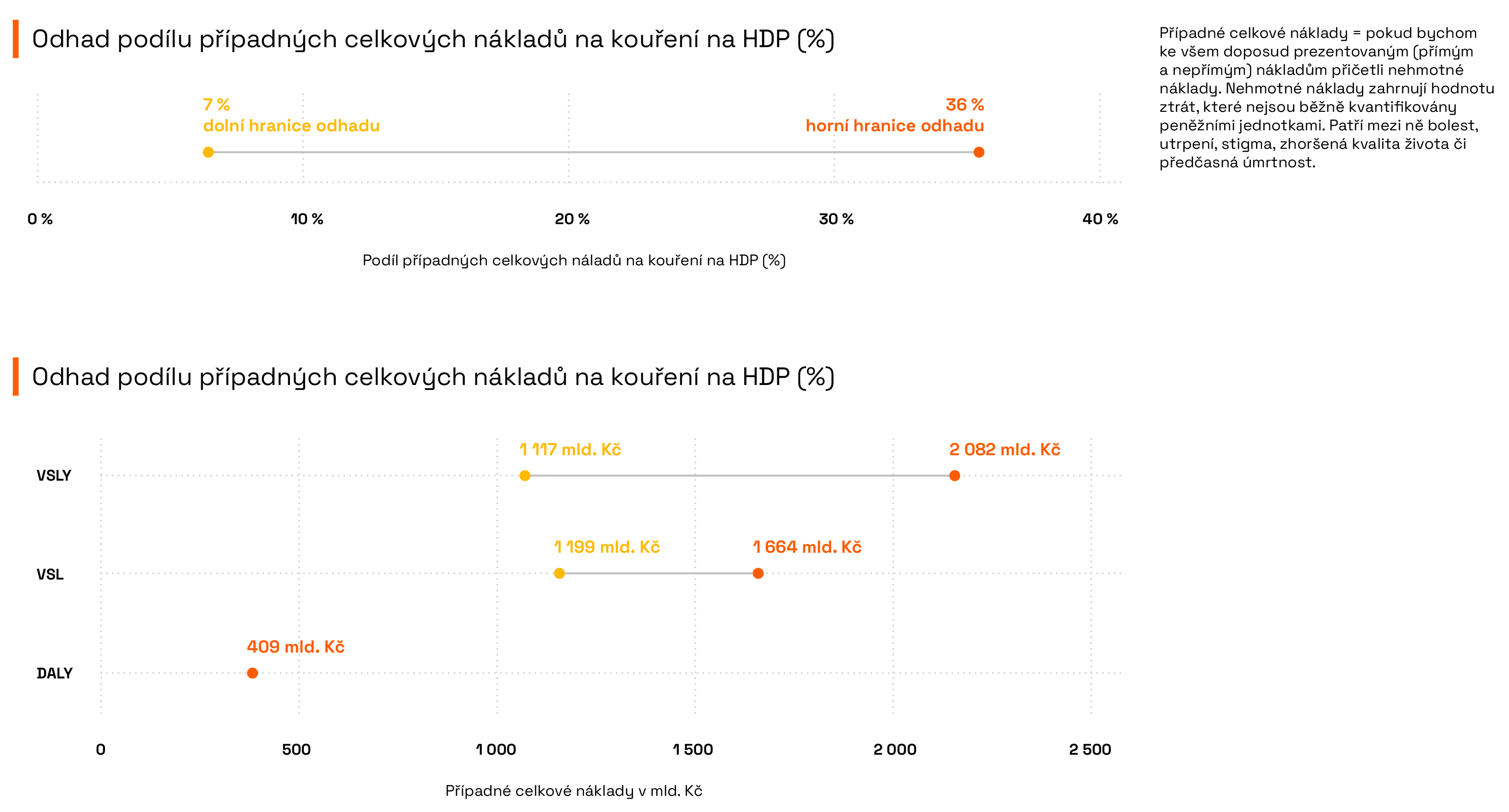 Pokud by se tyto nehmotné náklady započetly, celkové náklady kouření by v roce 2019 činily přibližně 7–36 % HDP 2019. To znamená, že by kouření představovalo ekonomickou zátěž srovnatelnou, či až výrazně vyšší, než jsou roční výdaje státu za daný rok na celé sektory, například zdravotnictví (7,8 %) či školství (3–4 %). V praxi by tak šlo o stovky miliard korun, jejichž hodnota je sice obtížně měřitelná, ale o to více vypovídá o rozsahu společenské újmy spojené s kouřením v české populaci (OECD/European Observatory on Health Systems and Policies, 2021; OECD, 2019). Uvedený rozsah je vyjádřen vůči skutečně dosaženému HDP daného roku, ačkoli v literatuře se nehmotné náklady častěji vztahují spíše k potenciálnímu HDP.