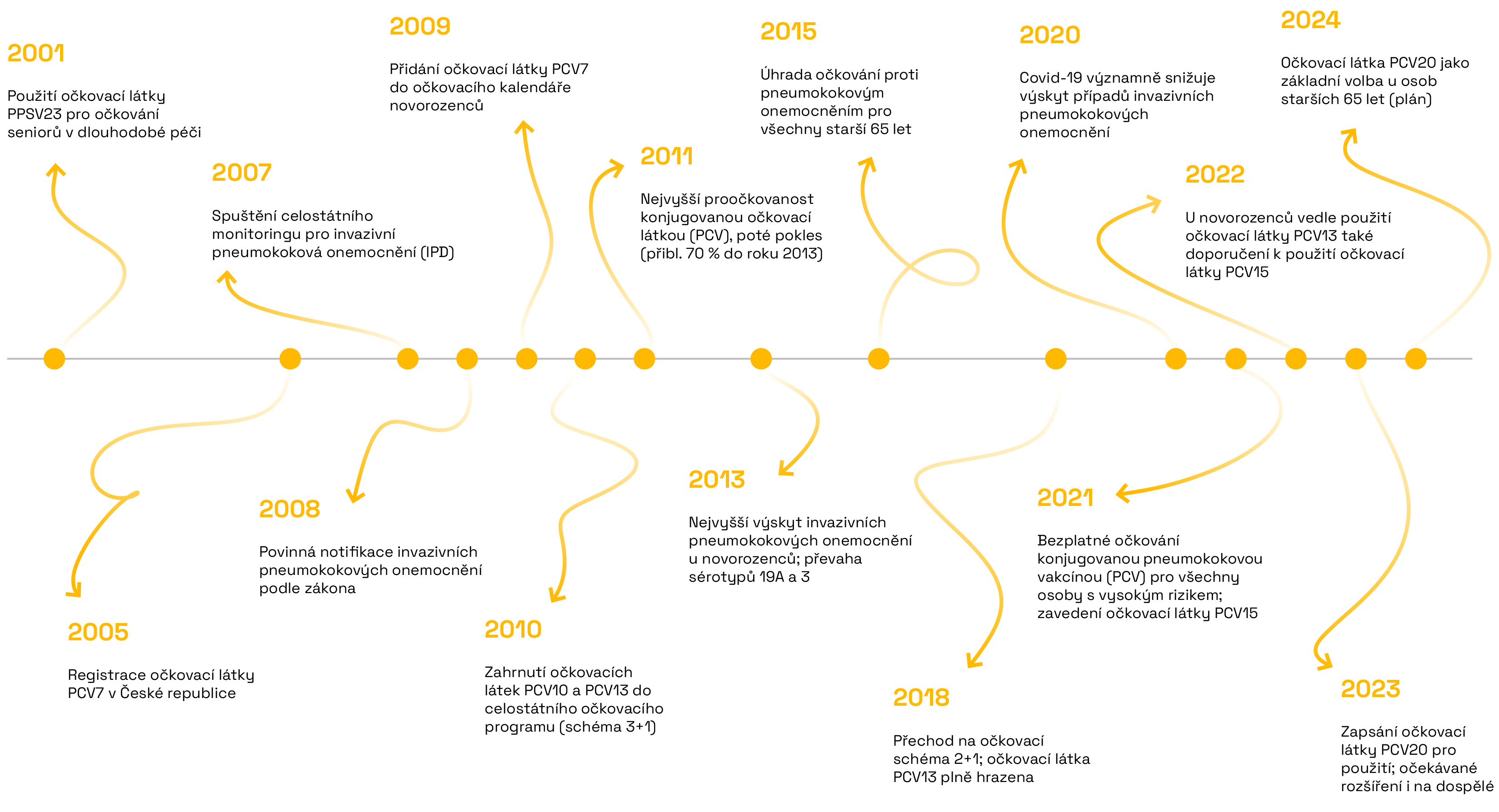 Infografika 2 znázorňuje časovou osu aktivit souvisejících v České republice s pneumokokovými onemocněními.