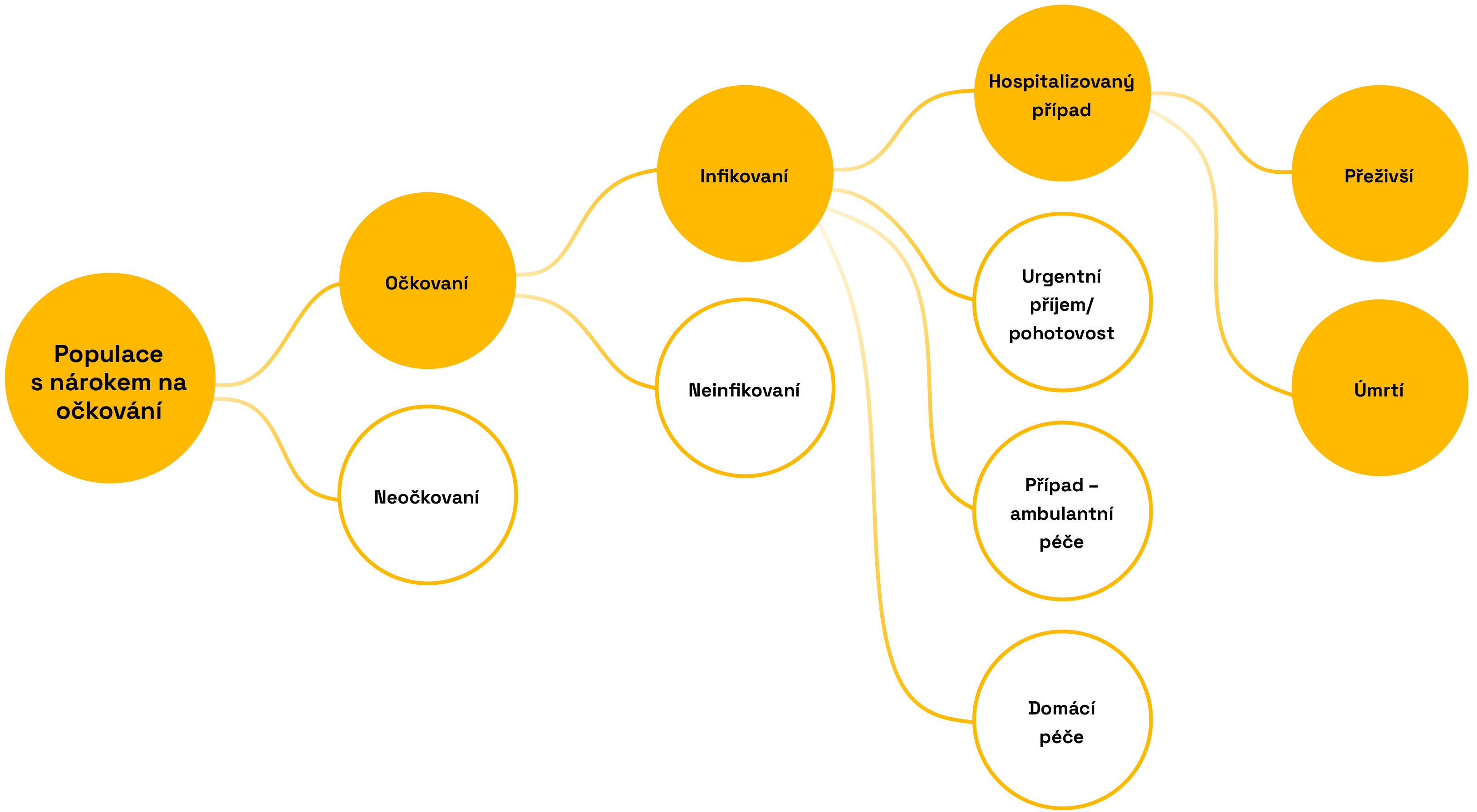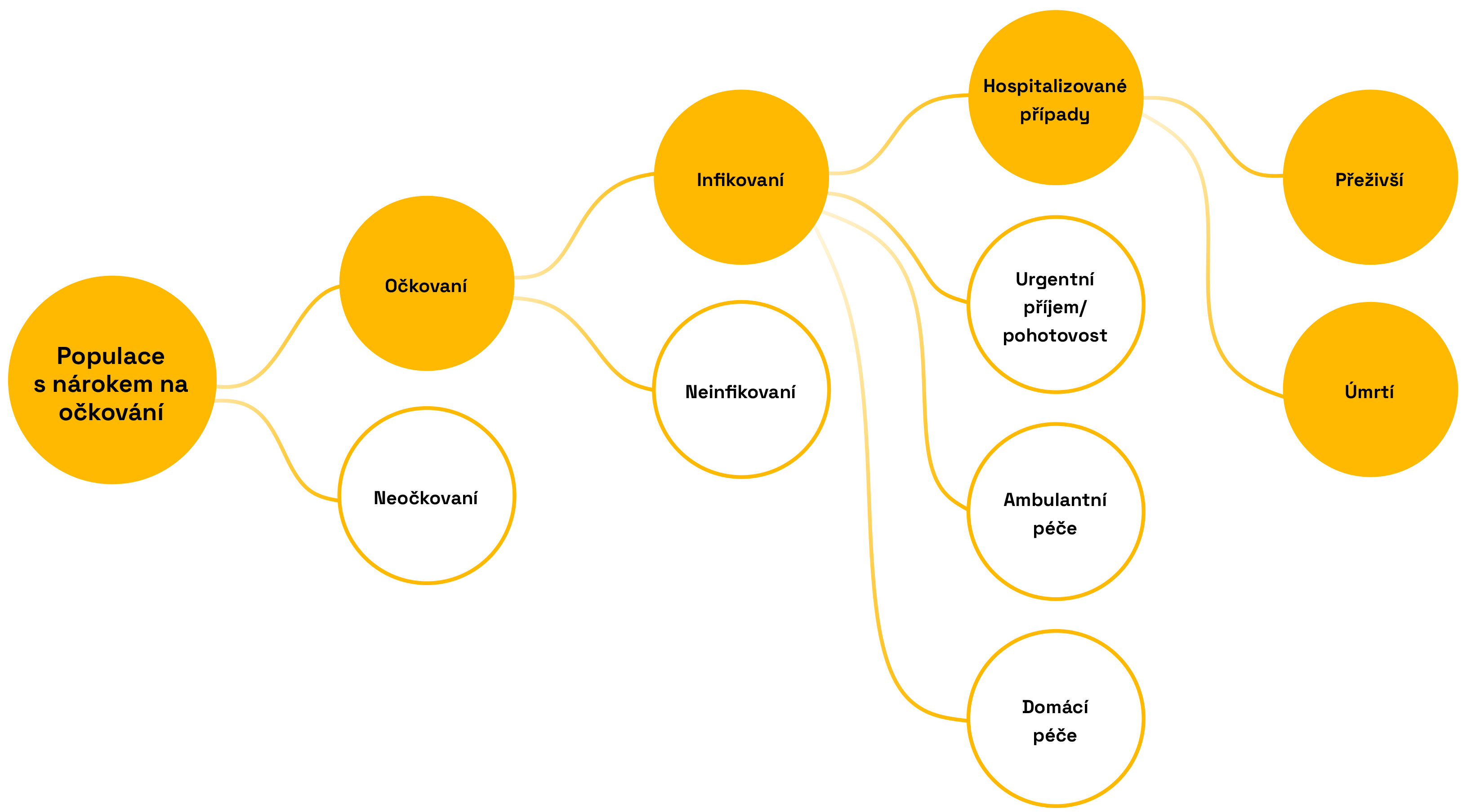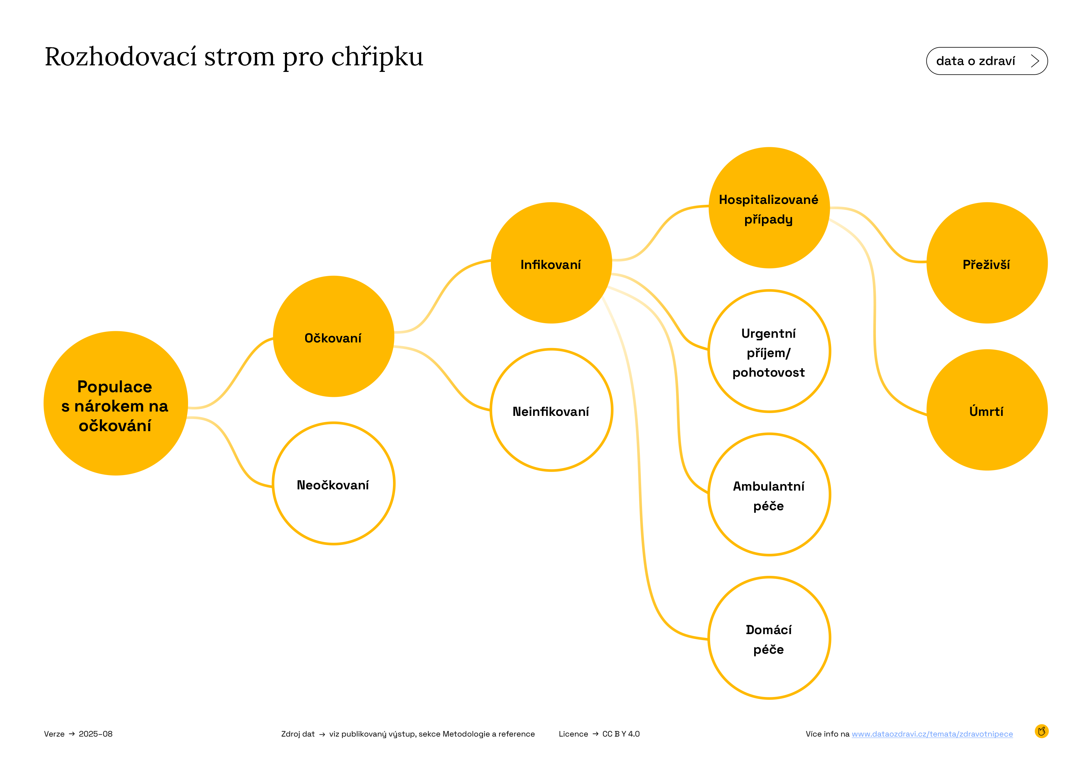 Očkování proti chřipce probíhá podle postupu znázorněného na Infografice 3. Prvním krokem je očkování vybrané skupiny osob. Některé z nich očkování chrání, někdo se ale může stále nakazit v důsledku omezené účinnosti vakcíny. Z těch, kdo se nakazí, někteří vyhledají praktického lékaře, navštíví pohotovost nebo urgentní příjem, jejich stav může vyžadovat hospitalizaci, a v nejzávažnějších případech může dojít až k úmrtí. Očkovaní jedinci se těmto zdravotním následkům vyhnou – což se odráží v přínosech, které sledujeme v naší analýze.