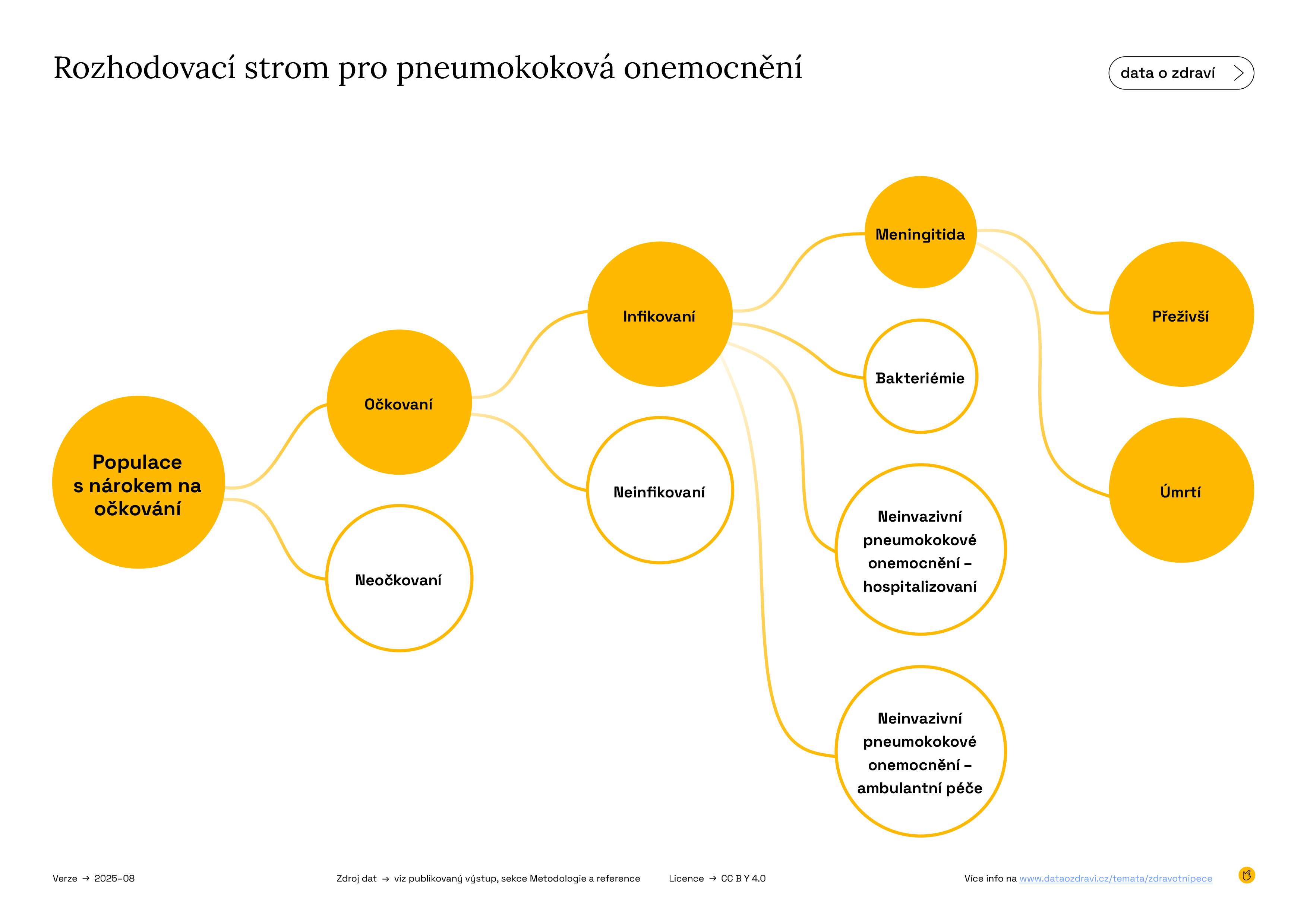 V případě neinvazivní pneumokokové pneumonie (NBPP) se pacienti v závislosti na závažnosti svého stavu buď uzdraví, nebo zemřou. Jejich léčba probíhá buď ambulantně (bez hospitalizace přes noc), nebo v nemocnici, pokud jejich stav vyžaduje hospitalizaci. K popisu četnosti hospitalizací a ambulantně léčených případů jsme použili údaje Ústavu zdravotnických informací a statistiky (ÚZIS) a kódy ICD-10. Informace o incidenci a úmrtnosti na invazivní pneumokoková onemocnění jsme získali od Státního zdravotního ústavu (SZÚ). Počet případů a úmrtí u neinvazivních pneumokokových onemocnění jsme odhadli na základě údajů o invazivních pneumokokových onemocněních (viz metodika a referenční dokument).