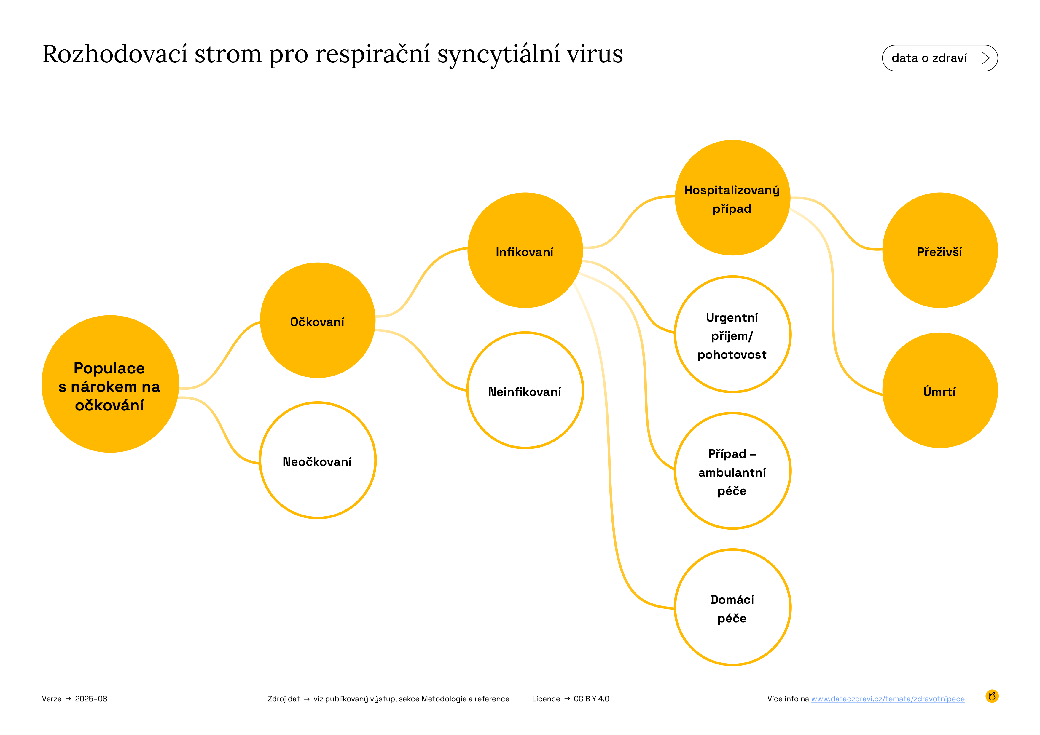 Očkování proti respiračnímu syncytiálnímu viru (RSV) se řídí postupem uvedeným na Infografice 5. Podle tohoto modelu jsou očkovány těhotné ženy nejméně ve 32. týdnu těhotenství. Část novorozenců tak získává ochranu proti RSV, zatímco ostatní zůstávají zranitelní a mohou se nakazit. Vakcína není stoprocentně účinná a část dětí se může stále nakazit. Některé z nich pak vyžadují péči praktického lékaře, navštíví pohotovost nebo urgentní příjem, jejich stav může vyžadovat hospitalizaci, nebo mohou dokonce zemřít. Děti, které jsou chráněné, se všem těmto následkům vyhnou, tento rozdíl představuje zdravotní přínos, který sledujeme v naší analýze.