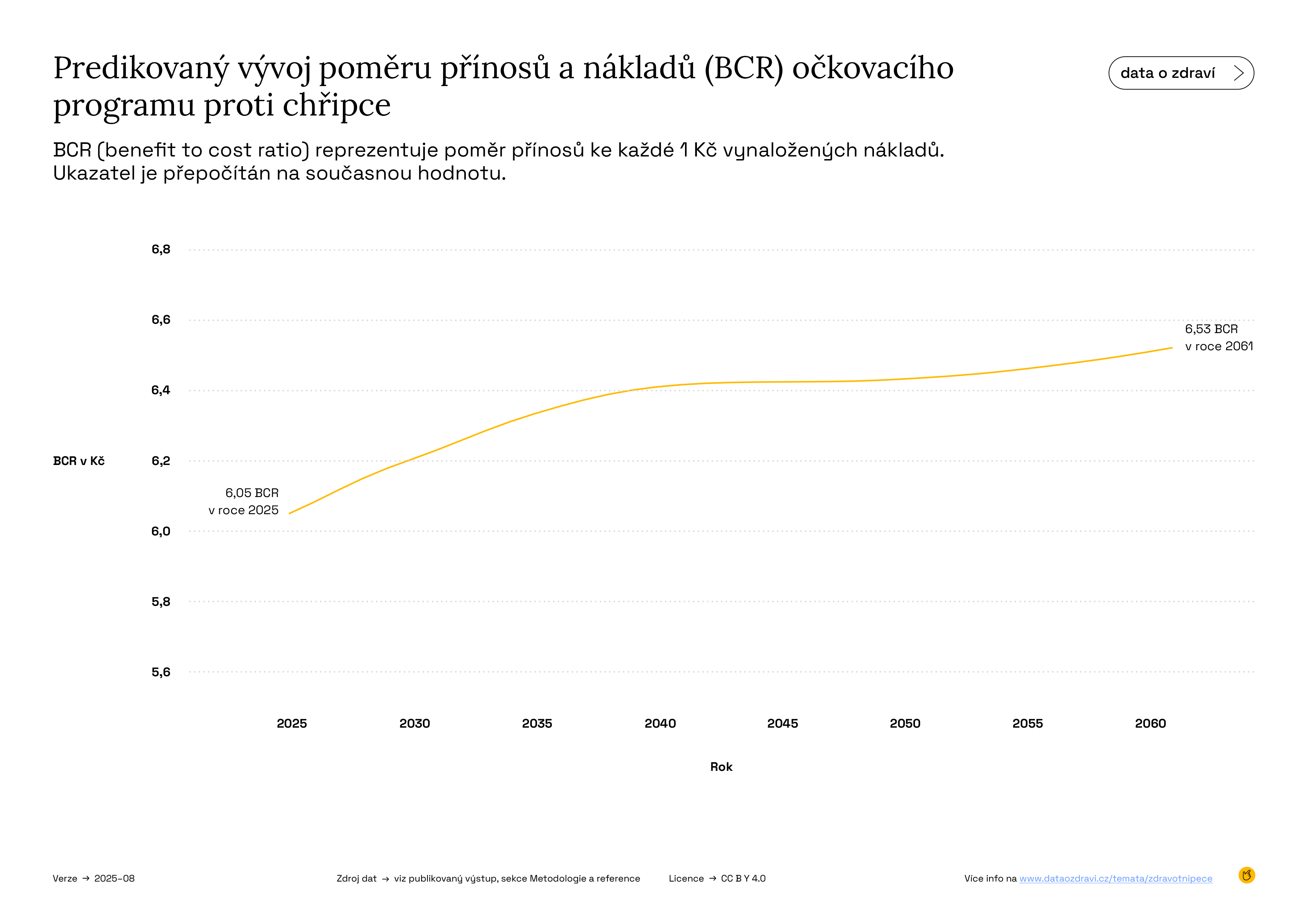 Chřipka – poměr přínosů a nákladů činí 6,53 (scénář 1) a 6,04 (průzkumná analýza). To znamená, že každá investovaná koruna přináší přínosy odpovídající více než 6 korunám. Očkování proti chřipce je tak jasně nákladově efektivní, zejména díky prevenci úmrtí starších dospělých.
