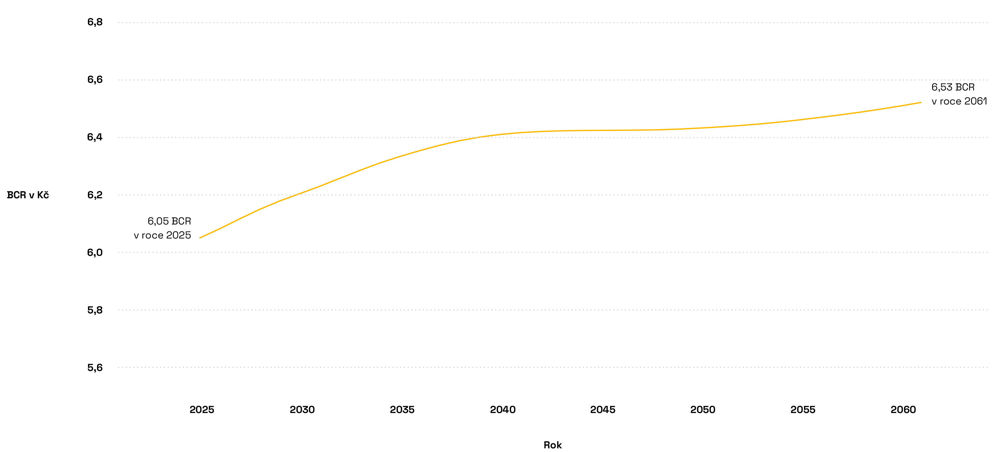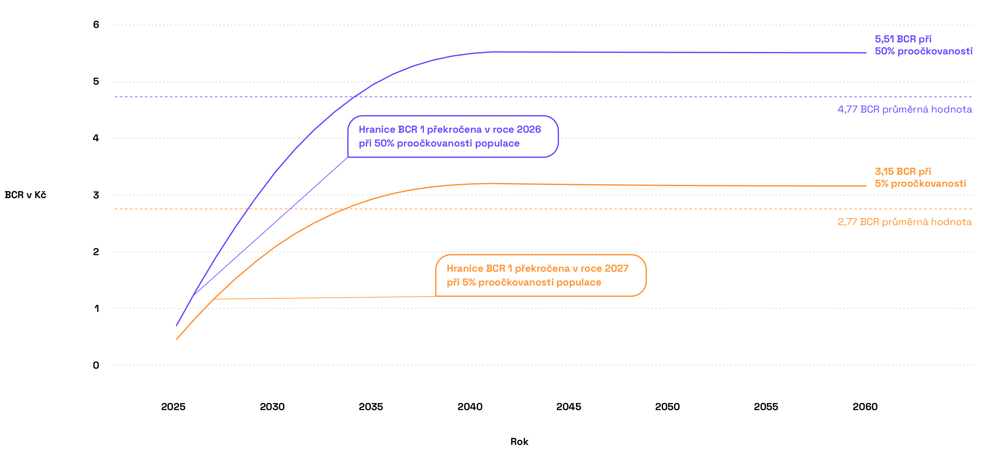 Už v roce 2026 začínají přínosy převyšovat náklady. V průběhu času je průměrný poměr nákladů a přínosů pro tento program 4,77 a dosahuje vrcholu v roce 2041 (5,53) a zůstává stabilní a na konci období končí na 5,51. Fialové body v grafu znázorňují růst poměru přínosů a nákladů v průběhu času, fialová vodorovná čára představuje průměrnou hodnotu.