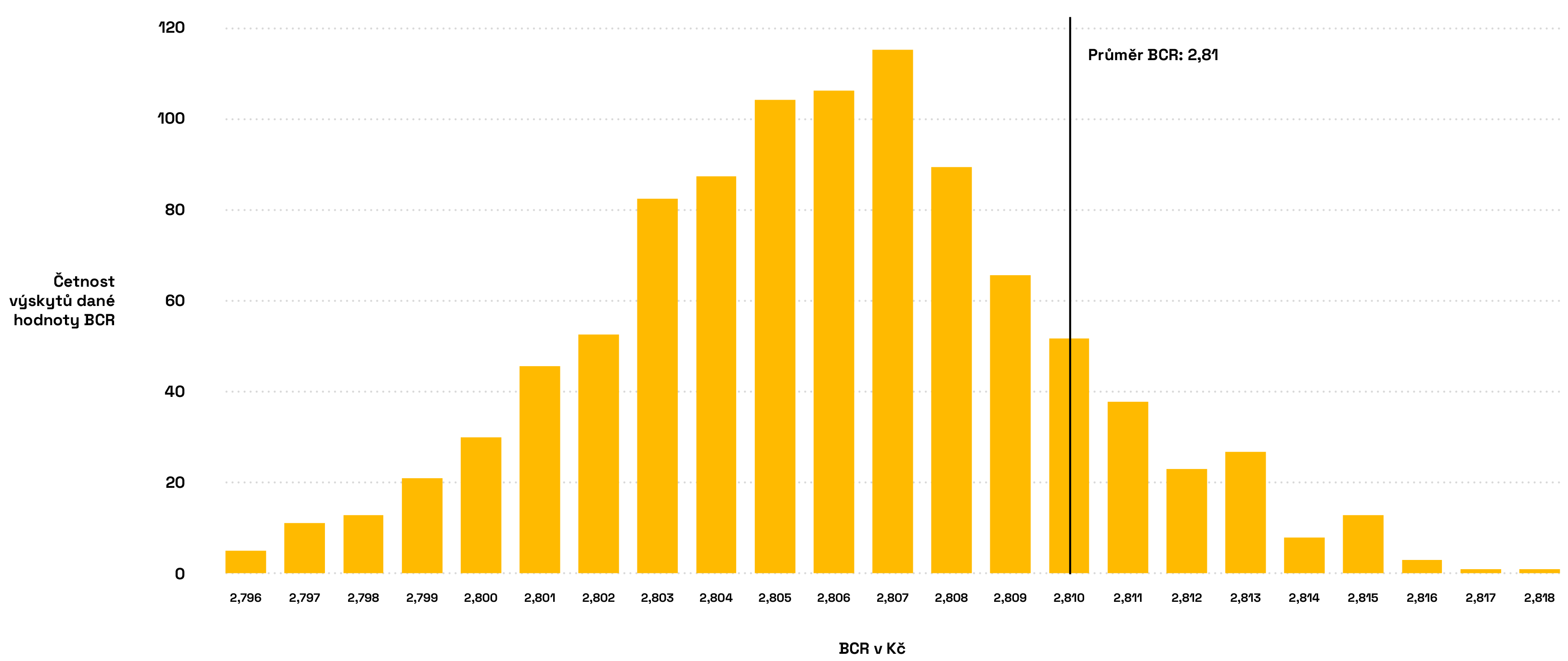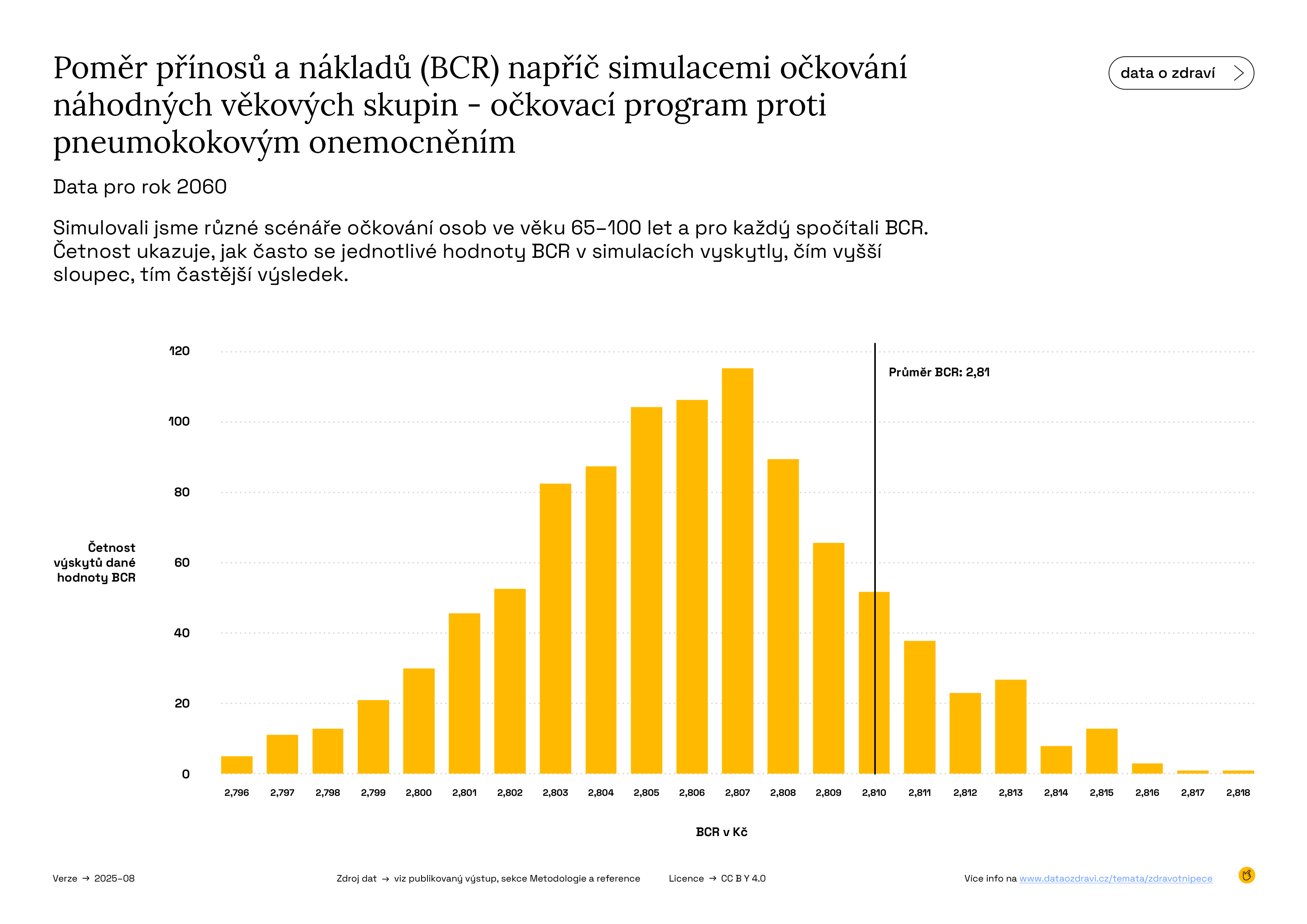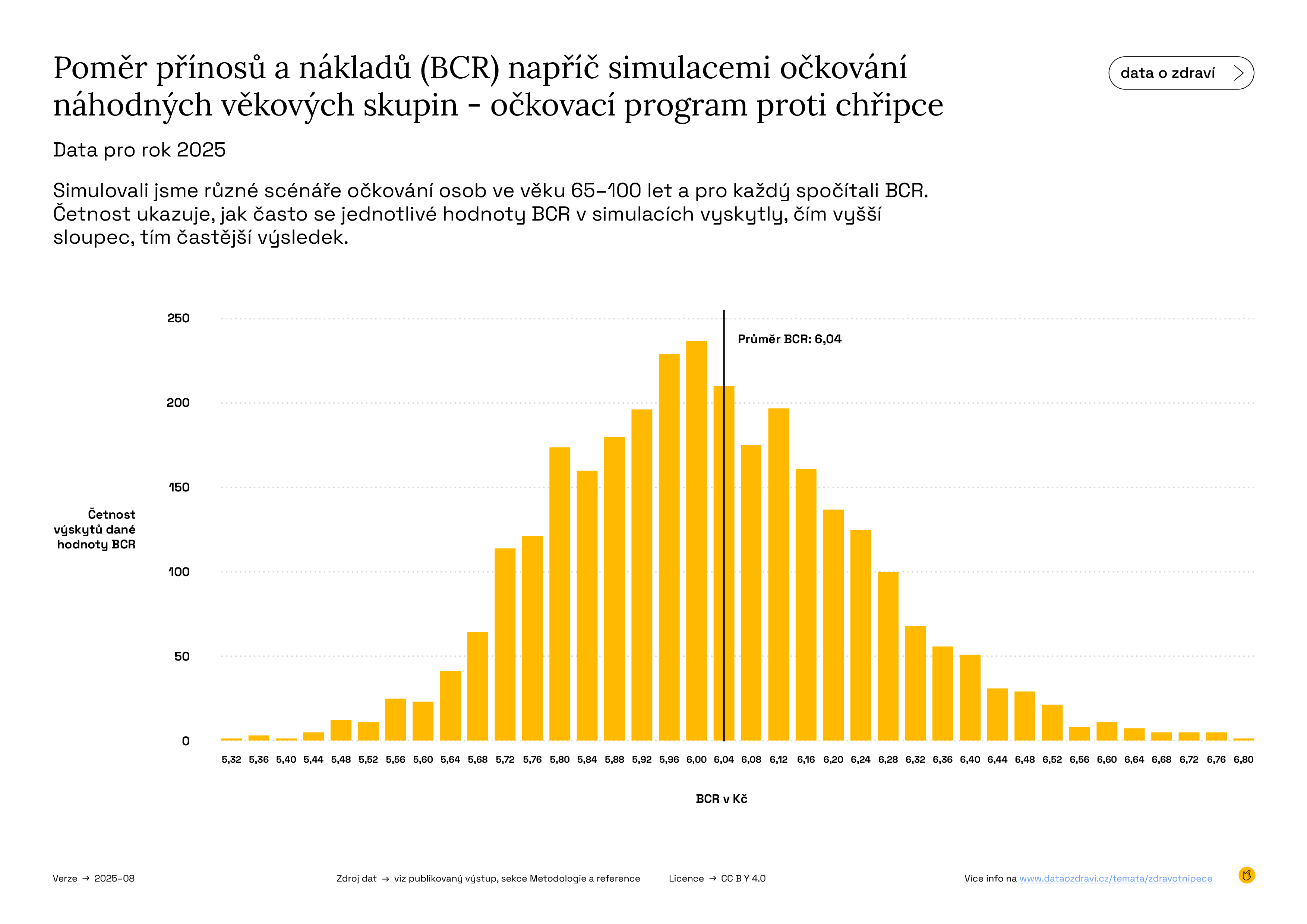 Graf zobrazuje četnost výskytu jednotlivých hodnot poměru přínosů a nákladů (BCR) – tedy jak často bylo očkování z pohledu nákladů vysoce nebo středně efektivní či méně výhodné. Čím vyšší je sloupec, tím častěji se vyskytla daná hodnota poměru přínosů a nákladů (BCR). Pokud například nejvyšší sloupec převyšuje hodnotu 2, byly přínosy očkování u většiny scénářů dvakrát vyšší než náklady. A protože většina hodnot leží nad hranicí BCR = 1, je očkování ekonomicky výhodné.
