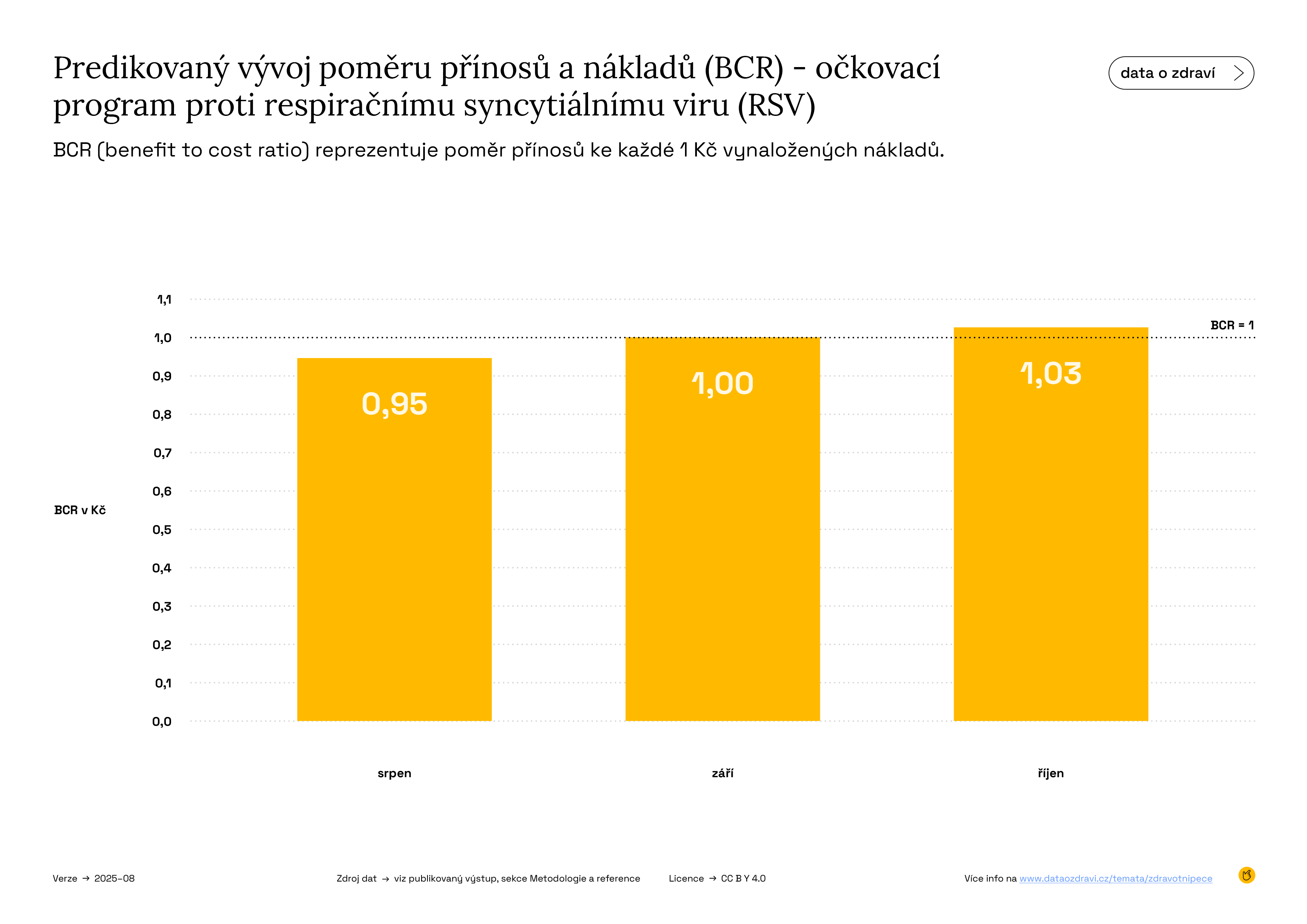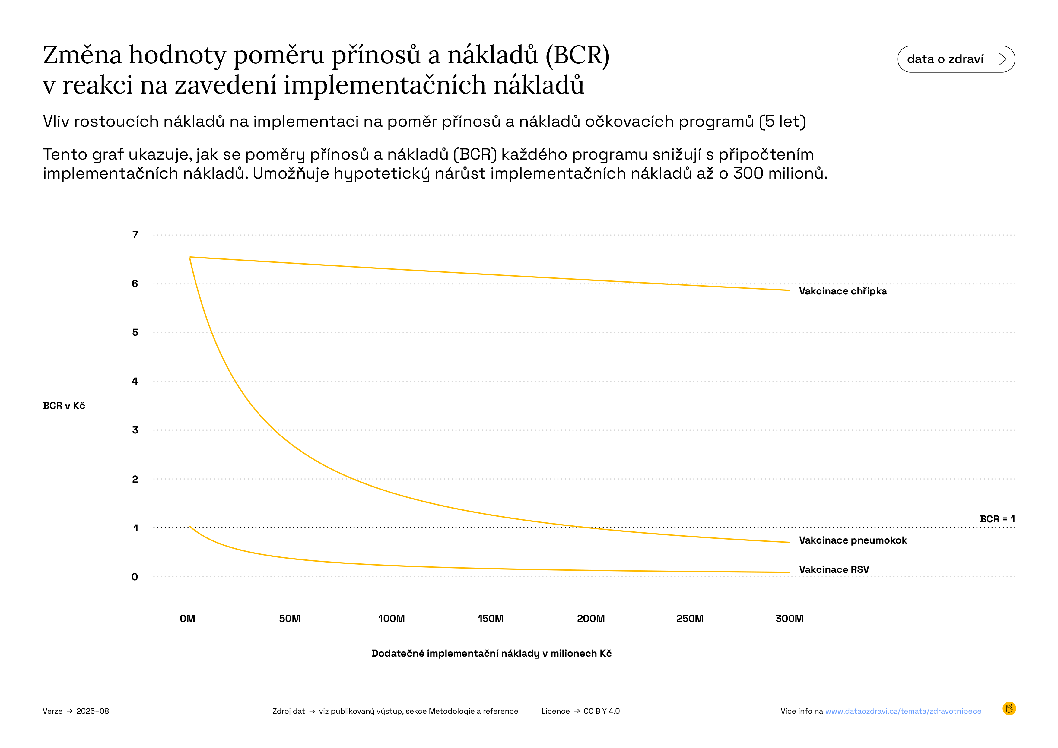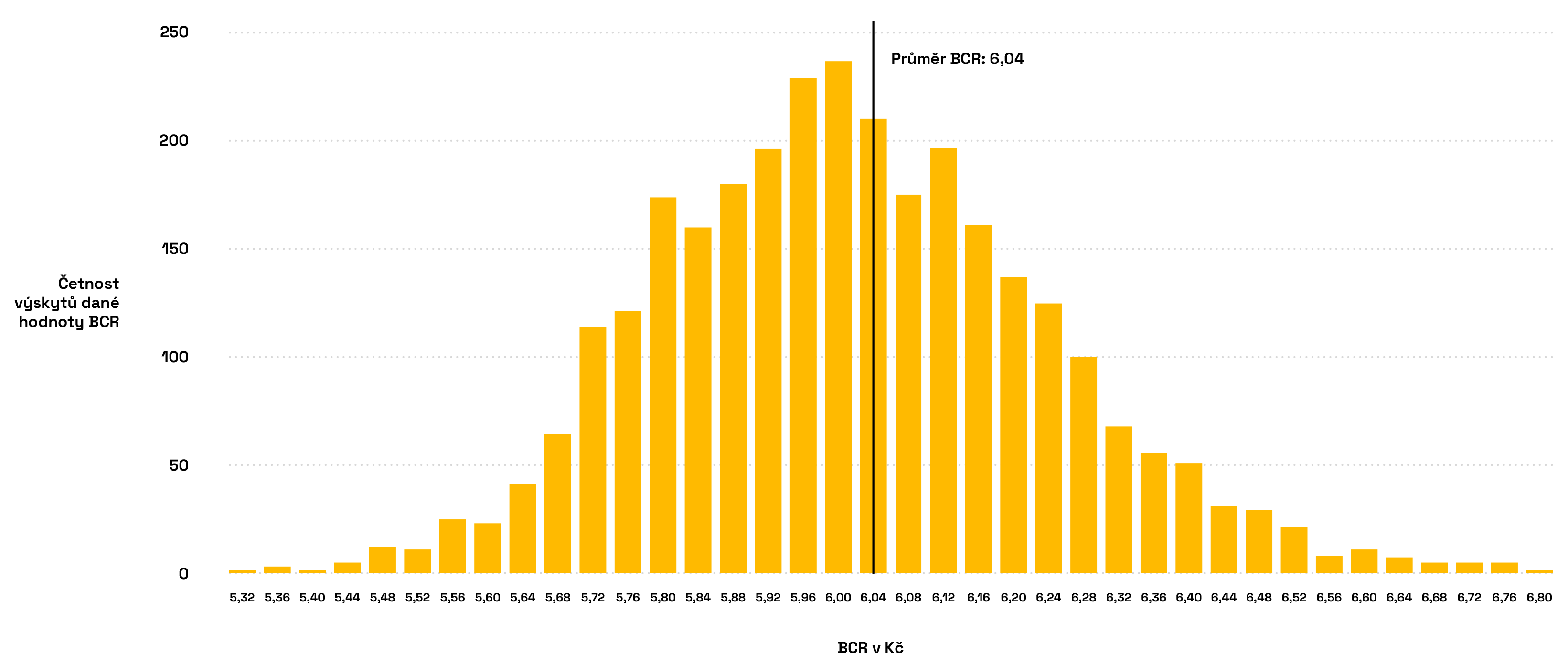 Graf zobrazuje četnost výskytu jednotlivých hodnot poměru přínosů a nákladů (BCR) – tedy jak často bylo očkování z pohledu nákladů vysoce nebo středně efektivní či méně výhodné. Čím vyšší je sloupec, tím častěji se vyskytla daná hodnota poměru přínosů a nákladů (BCR). Pokud například nejvyšší sloupec převyšuje hodnotu 2, byly přínosy očkování u většiny scénářů dvakrát vyšší než náklady. A protože většina hodnot leží nad hranicí BCR = 1, je očkování ekonomicky výhodné.