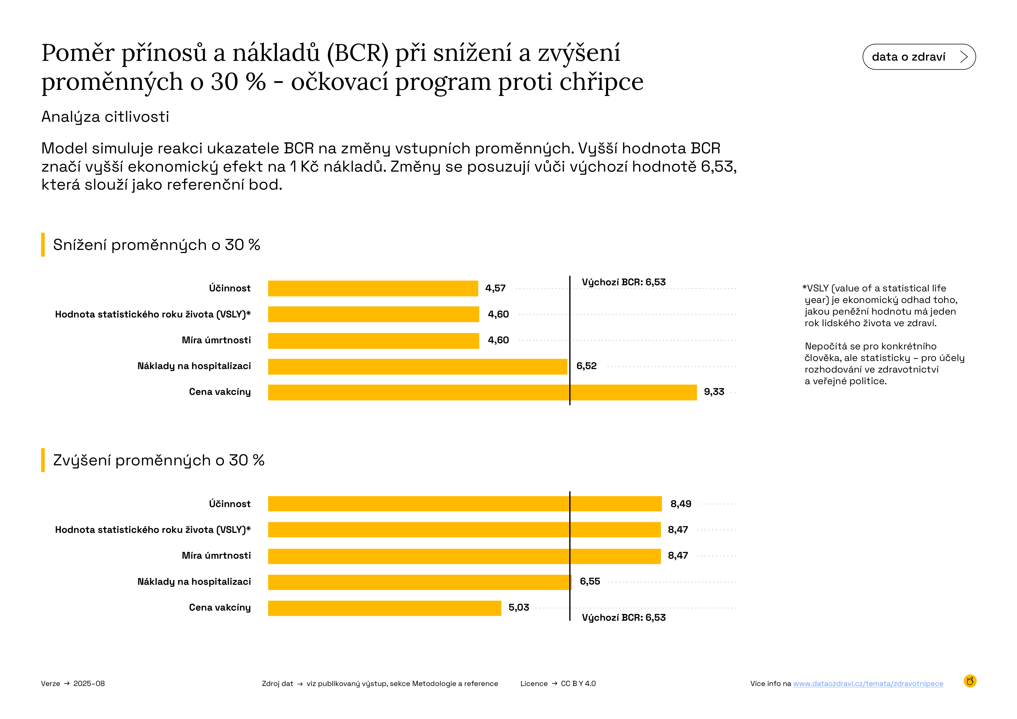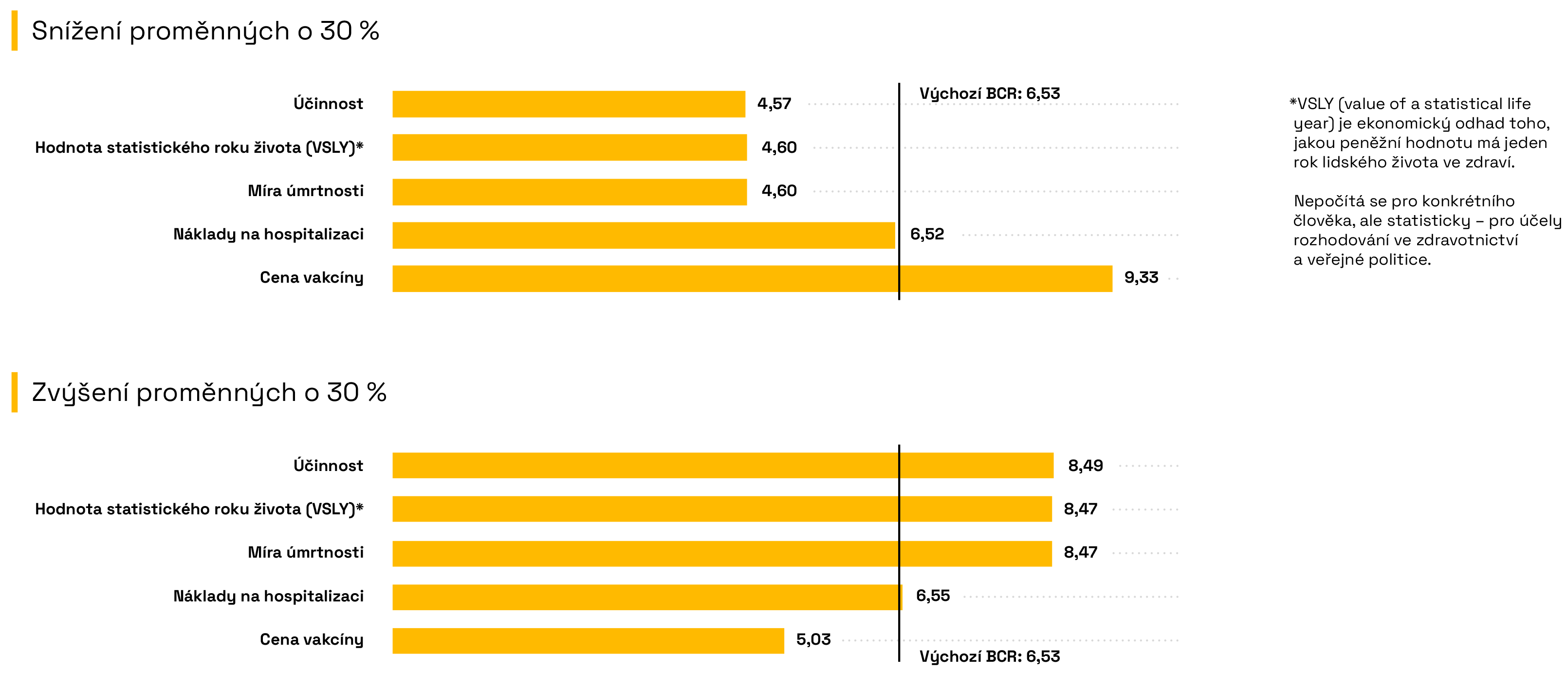 Infografika 7 zobrazuje, jak se mění poměr přínosů a nákladů (BCR) očkovacího programu proti chřipce, pokud se klíčové faktory upraví o 30 % směrem nahoru nebo dolů. Tento typ analýzy se označuje jako analýza citlivosti – umožňuje odhadnout změnu v poměru přínosů a nákladů (BCR) ve chvíli, kdy se mění pouze jeden ze vstupních údajů a všechny ostatní hodnoty zůstávají stejné. Díky tomu můžeme sledovat, které faktory mají na konečný výsledek největší vliv.