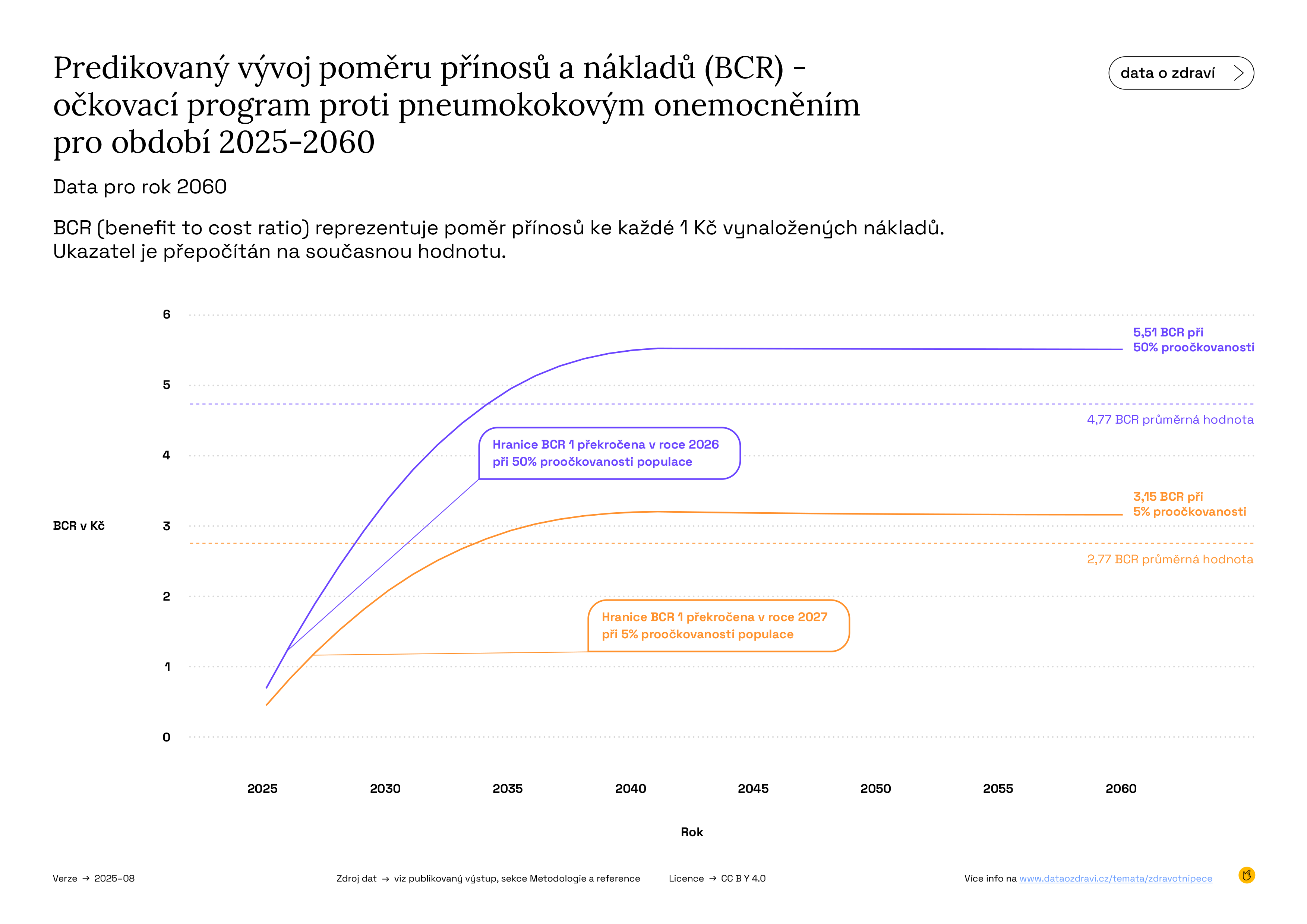 V tomto případě začínají přínosy převyšovat náklady v roce 2027. BCR se stabilizuje na hodnotě 3,15, přičemž průměrná hodnota v čase činí 2,77 (oranžová čára). Nižší přínos u tohoto scénáře vyplývá ze skutečnosti, že je naděje dožití u starších osob nižší než u těch, kterým je očkování podáno ve věku 65 let. Zachrání se méně let života, a proto jsou i přínosy podle metodiky pracující s hodnotou statistického roku života (VSLY) nižší.