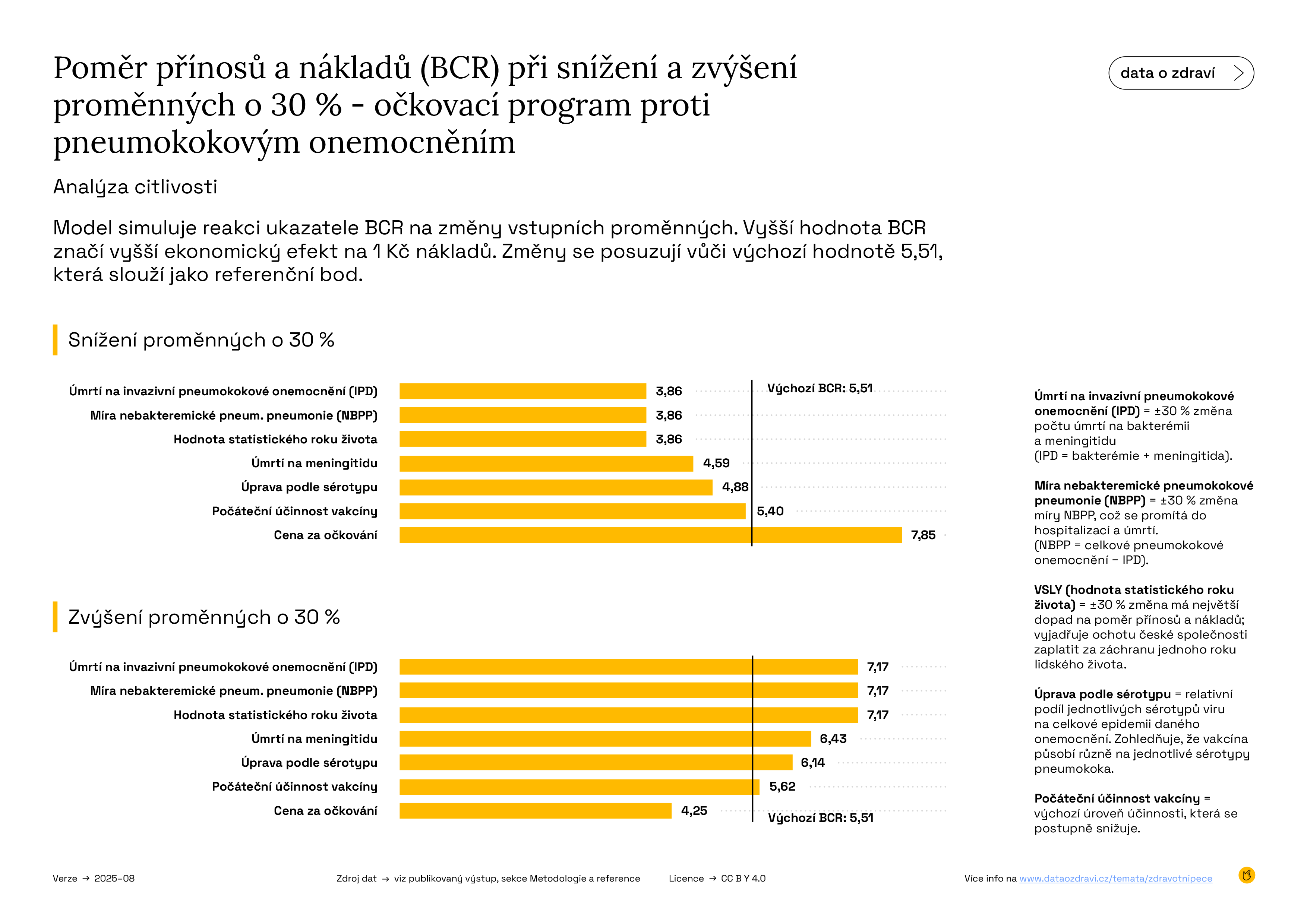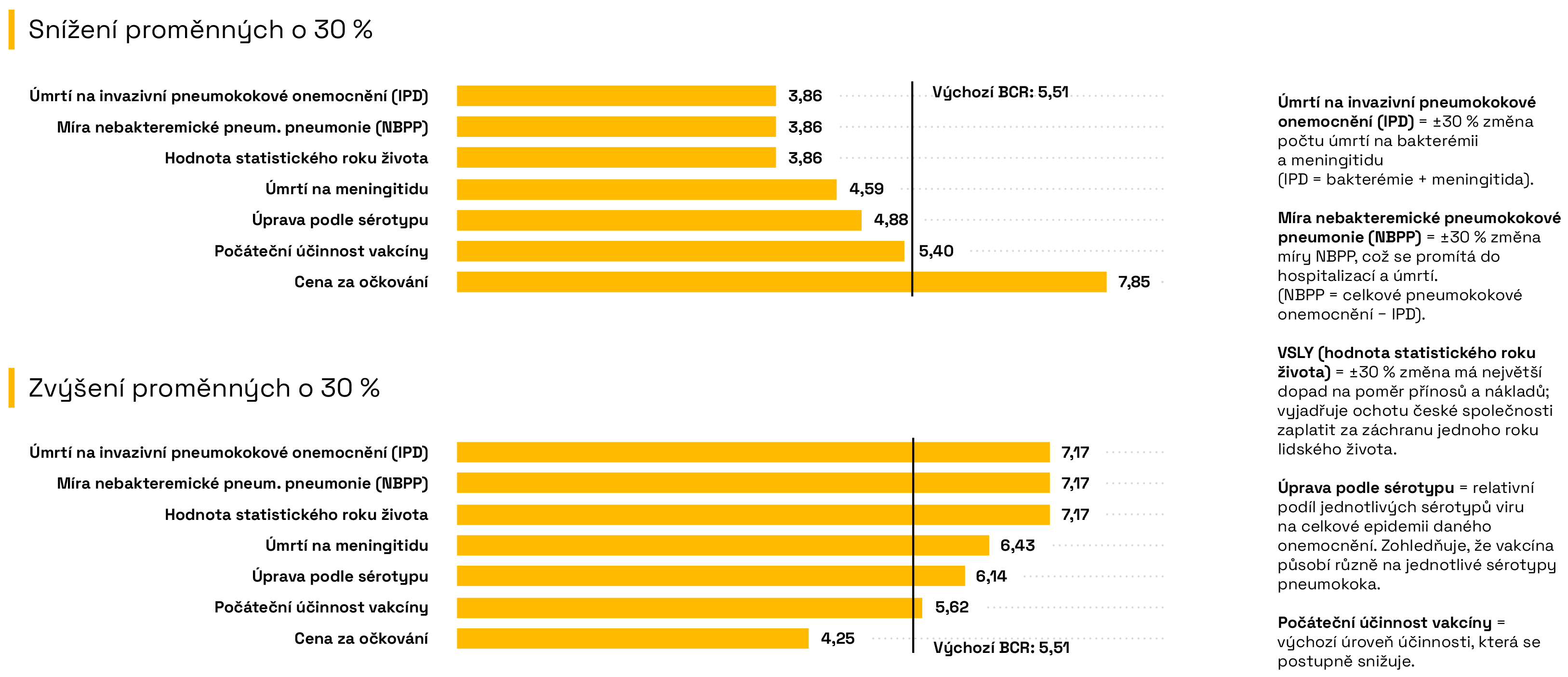 Jednosměrná analýza citlivosti – program očkování proti pneumokokovým onemocněním Infografika 9 ukazuje jednosměrnou analýzu citlivosti u modelu pro pneumokoková onemocnění. Bylo testováno, jak se BCR mění při úpravě klíčových faktorů v modelu o ±30 %.