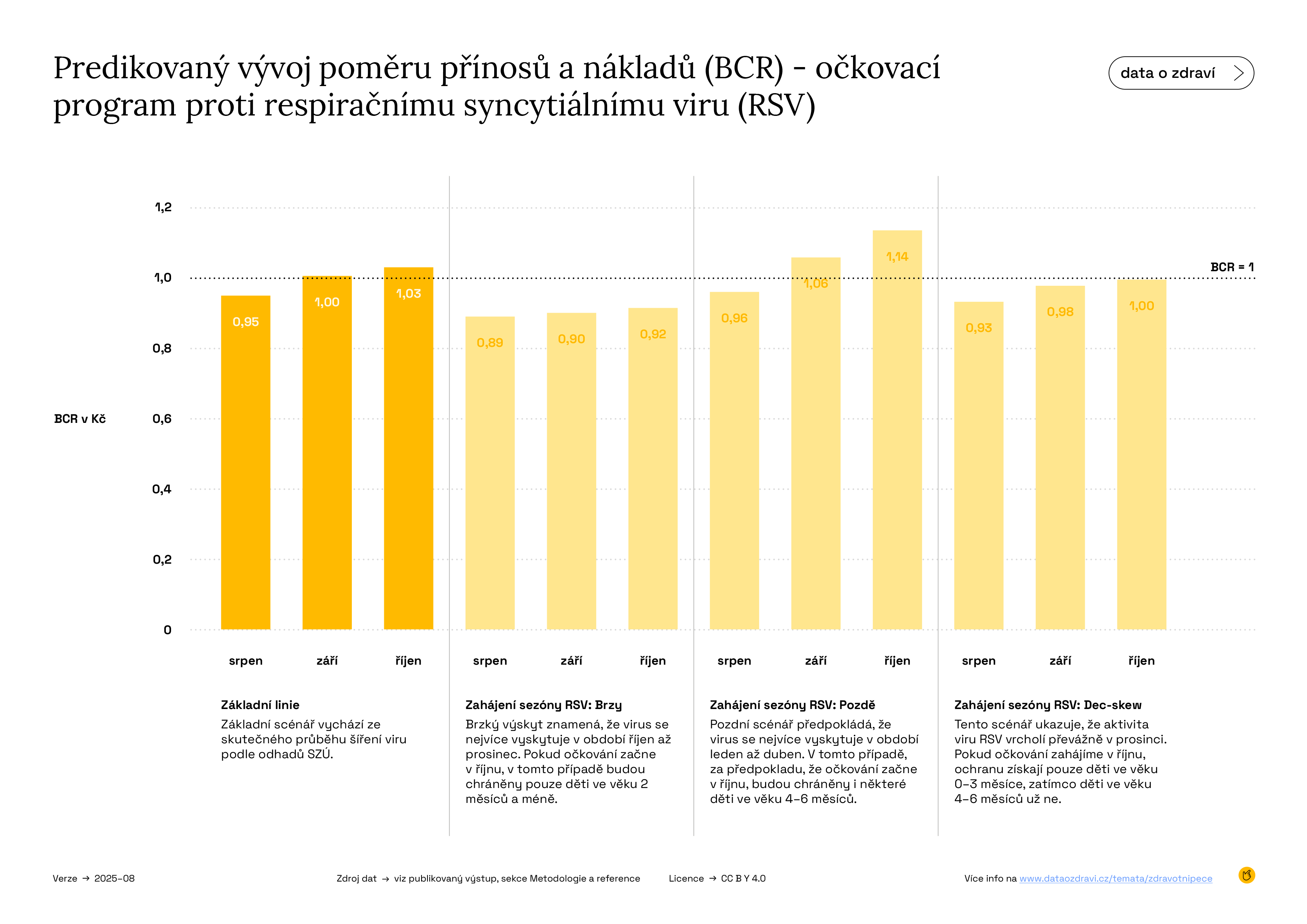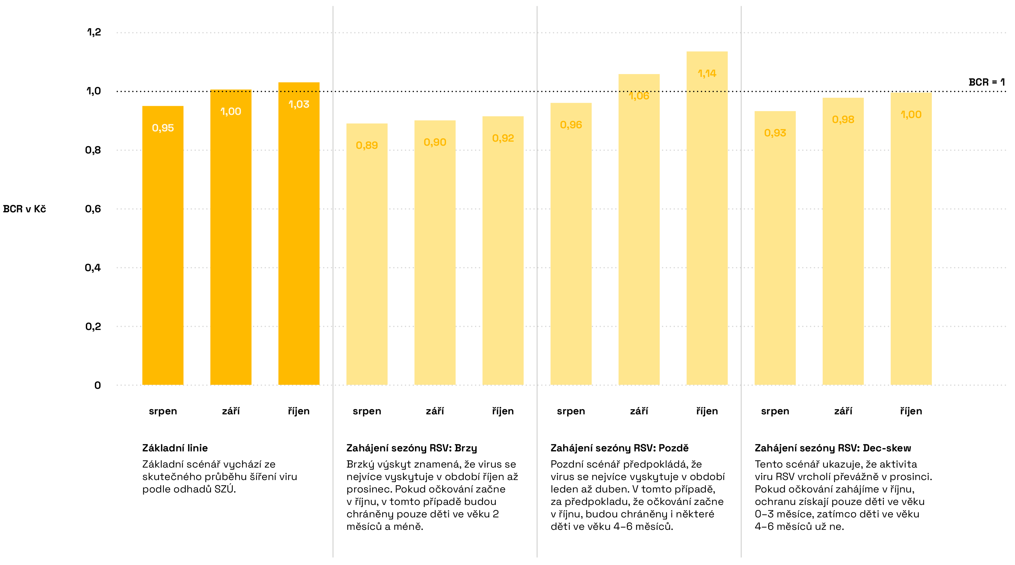 Infografika 10a ukazuje poměr přínosů a nákladů (BCR) u očkovacího programu proti respiračnímu syncytiálnímu viru (RSV) podle měsíce, ve kterém začíná ochrana programu. Analýza proto pracuje se třemi scénáři.