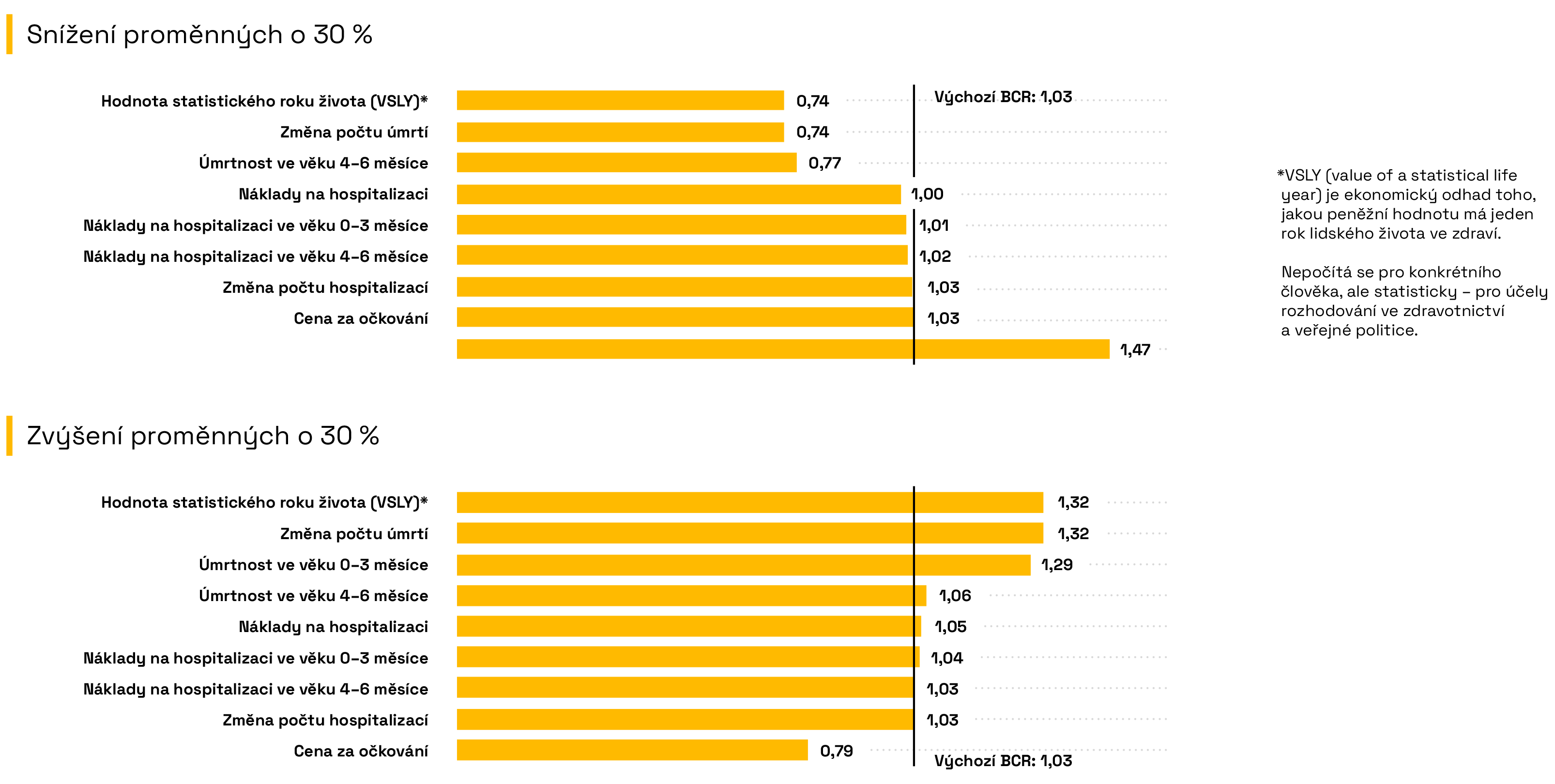 V důsledku těchto změn se poměr přínosů a nákladů (BCR) programu posouvá vzhledem k základní hodnotě, kterou představuje svislá linie na úrovni 1,03. Například pokud klesne cena vakcíny o 30 %, BCR se zvýší z 1,03 na 1,47. Naopak, pokud cena vakcíny o 30 % vzroste, BCR se sníží na 0,8, protože vyšší náklady na očkovací program snižují čisté přínosy programu.