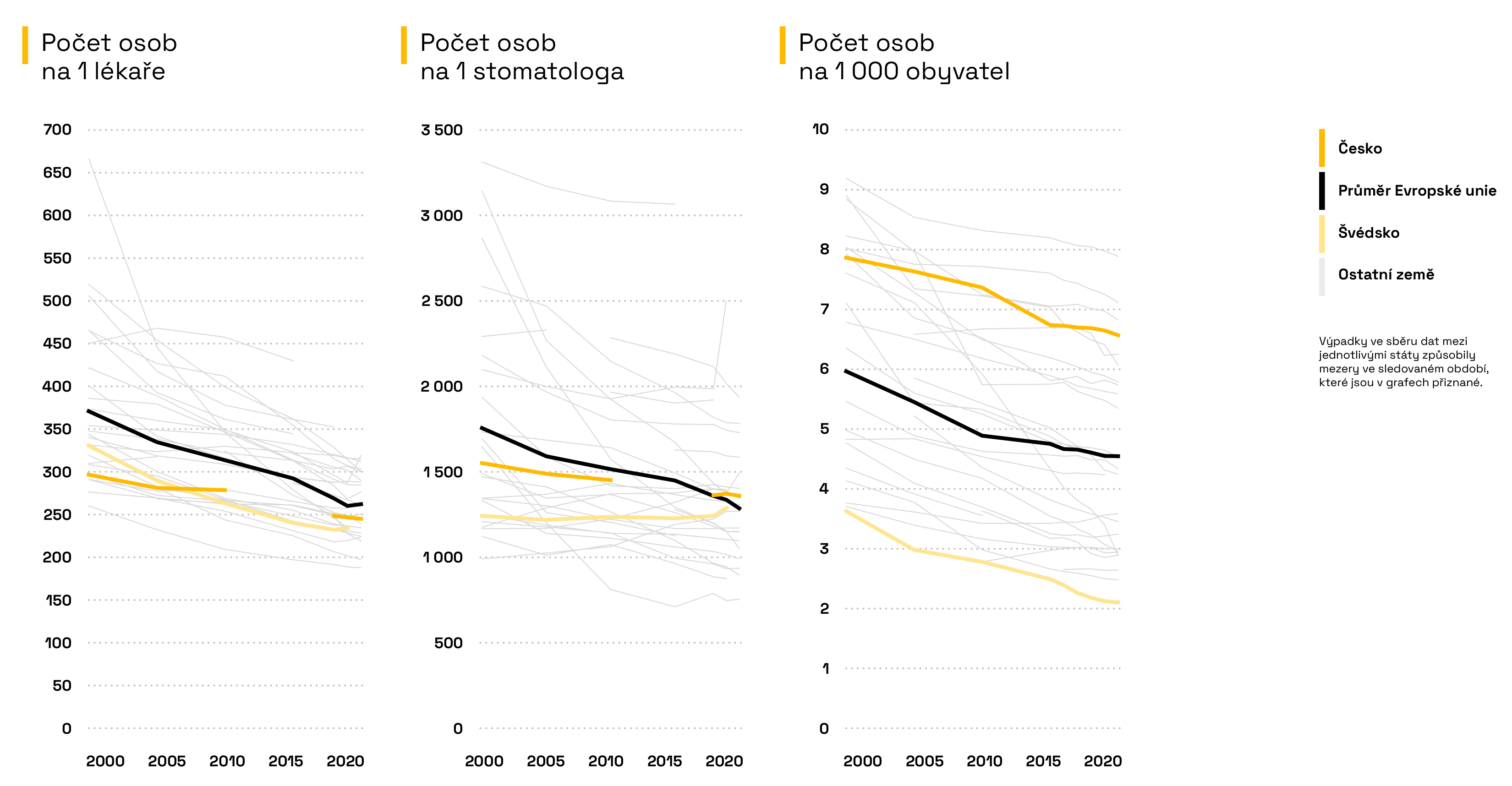 Graf zobrazuje vývoj situace praktikujících lékařů, což jsou lékaři všech specializací (nejen praktického lékařství) vyjma stomatologů. V Česku od roku 1995 počet lékařů rostl až do roku 2020, kdy počet osob připadajících na jednoho lékaře klesl o přibližně 100. V roce 2020 připadalo 244 osob na jednoho praktikujícího lékaře (oproti evropskému průměru 261 osob). Česko bylo v tomto ukazateli dostupnosti péče lehce pod průměrem, nižší počet osob na jednoho lékaře má třeba Rakousko, Španělsko či Norsko. Oproti tomu hranici 300 osob na jednoho lékaře překračují Belgie, Francie a Maďarsko.